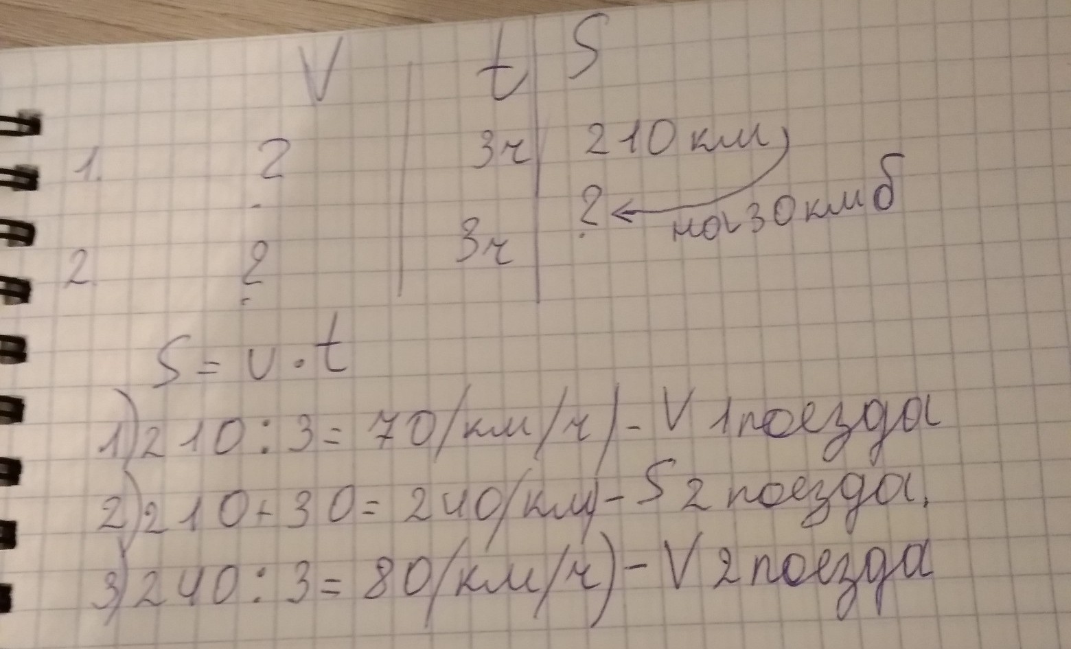 1) 210:3=70 км/ч - скорость ( V ) первого поезда