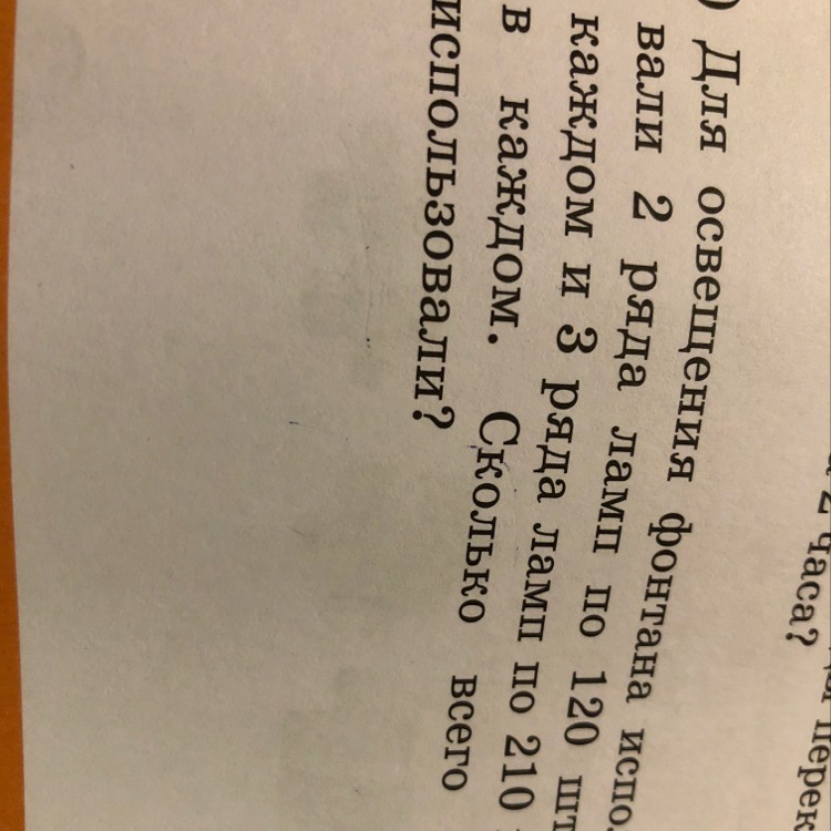 Для освещения фонтана использовали 2ряда ламп по 120 штук в каждом и 3 ряда ламп по 210 штук сколько всего ламп использовали