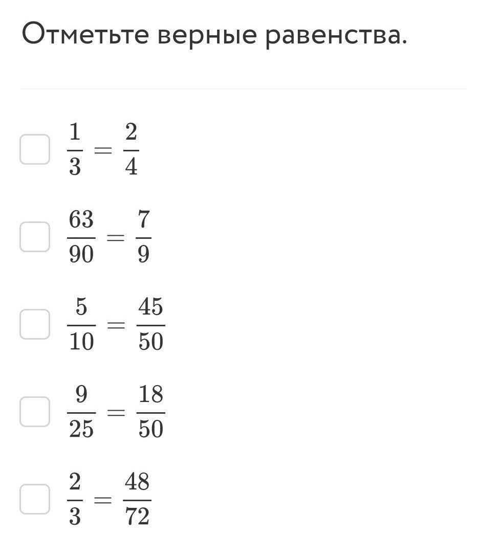 верные 9/25=18/50 и 2/3=48/72. верные, когда при сокращении получается справа и слева одинаковое число
