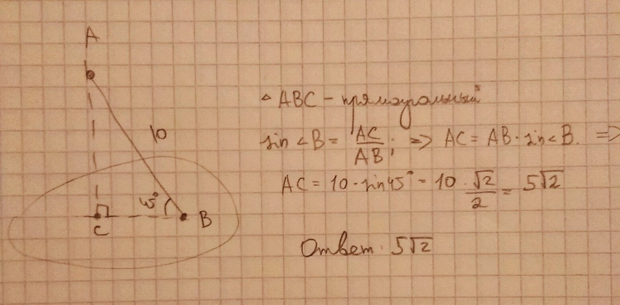 з точки до площини проведено похилу довжина якої 10 см. знайдіть відстань від точки до площини якщо похила утворює зі своєю проекцією кут 45°