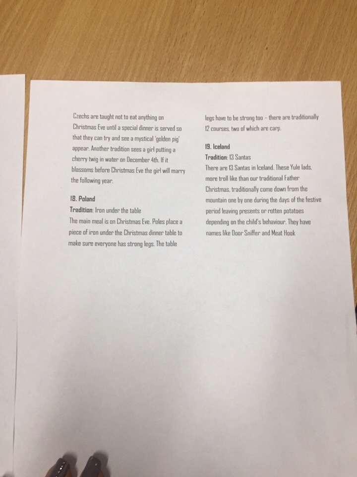 Чехов учат не есть ничего в канун Рождества до тех пор, пока не будет подан специальный ужин, поэтому ноги тоже должны быть натянуты. Традиционно существуют 12 блюд, два из которых - карп, на которых они могут попробовать и увидеть мистическую золотую свинью. веточка химии в воде 4 декабря. Если это произойдет до Lhristm на следующий год 9. Исландская традиция 13 Santas В Исландии 13 Santas. Эти йольские парни больше похожи на троллей, чем наше традиционное Дед Мороз, традиционно спускаются с горы один за другим в дни праздничной вечеринки, оставляя подарки. или гнилой картошкой, что влияет на поведение ребенка. У Евы, когда Ева выйдет замуж за 18 лет. Традиция Польши под столом. Основной праздник - в канун Рождества. Поляки кладут кусок железа под рождественский обед, который можно назвать именами таких, как Door Sniffer и Mcat Hook. убедитесь, что у всех сильные ноги