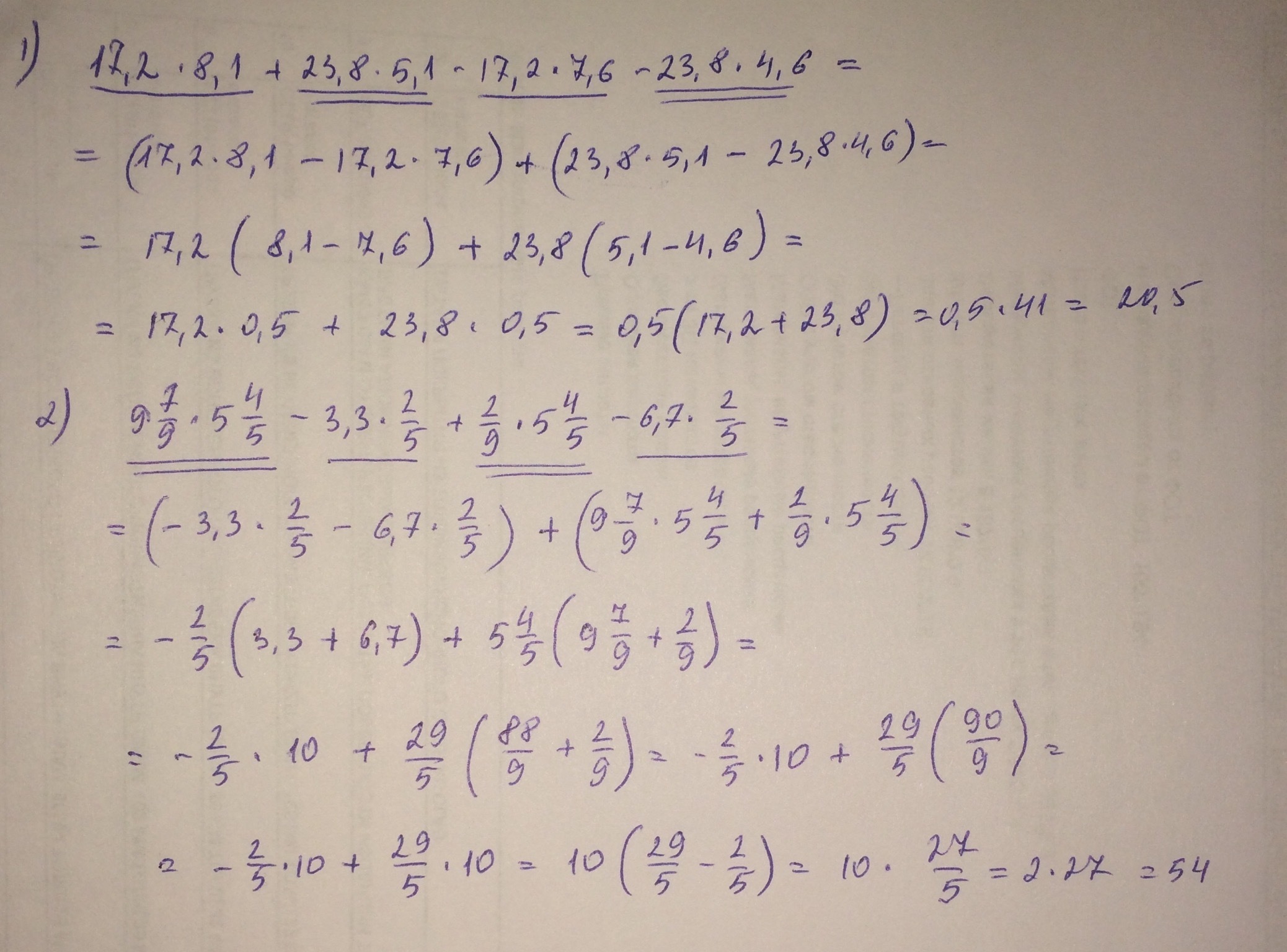 В 1 общий множитель 17,2 у 1 и 3 слагаемого, и 23,8 у 2 и 4 слагаемого. Их и группируем. Выносим общий множитель. Получилось два слагаемых и у них тоже есть общий множитель.