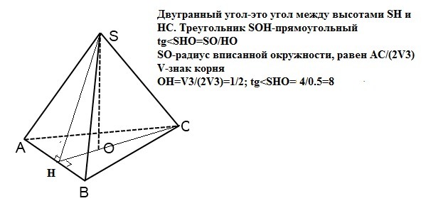 В правильной треугольной пирамиде сторона основания равна корень из 3 , высота пирамиды равна 4. Найдите тангенс угла между основанием и боковой гранью пирамиды.