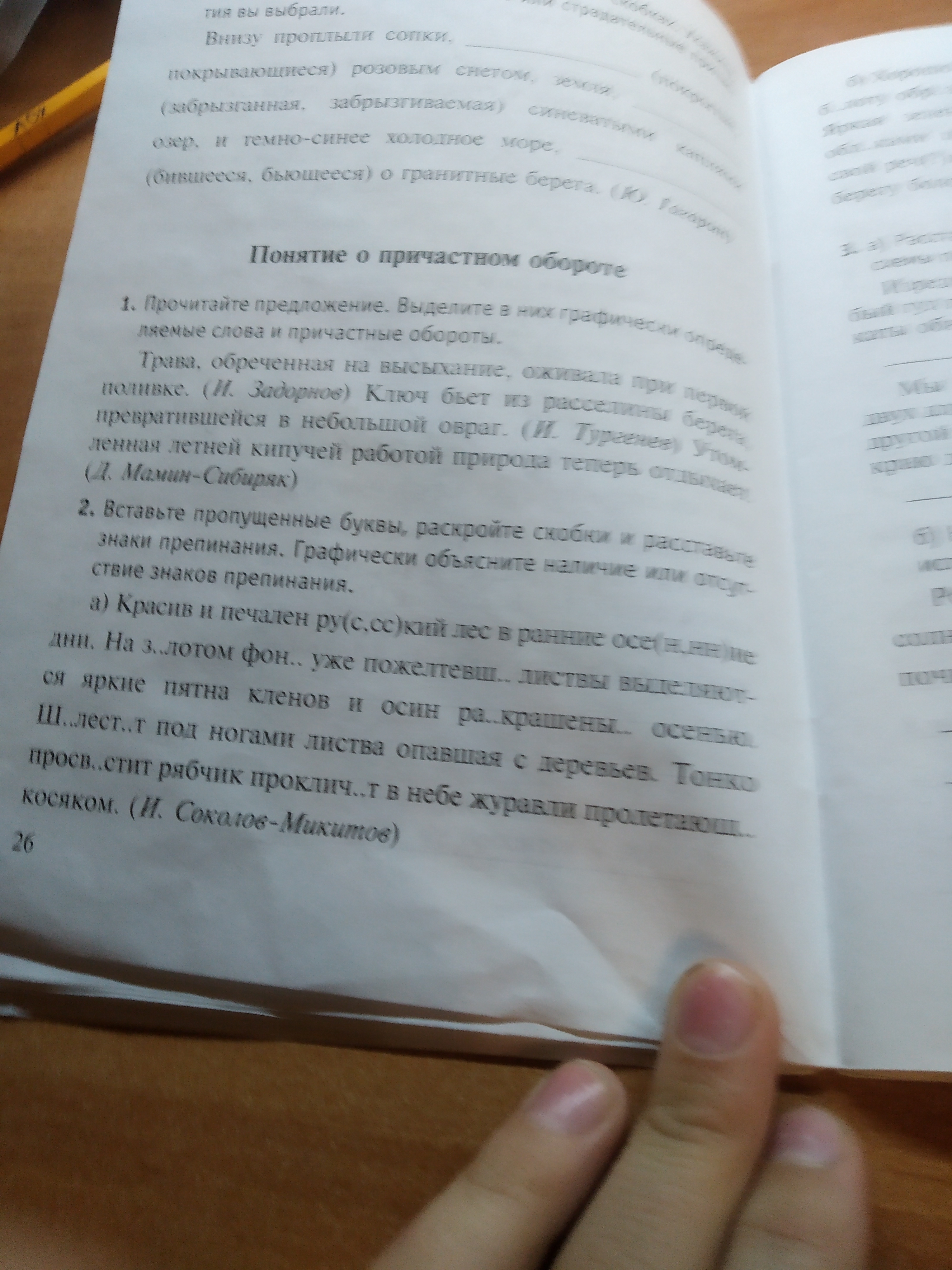 2.а) Красив и печален русский лес в ранние осенние дни.На золотом фоне уже пожелтевшей листвы выделяются яркие пятна клёнов и осин, раскрашенных осенью.(запятая,т.к. прич.об)Шелестит под ногами листва,опавшая с деревьев (прич.об).Тонко просвистит рябчик,прокличут в небе журавли,пролетающие косяком.(сложное предложение и прич.об)