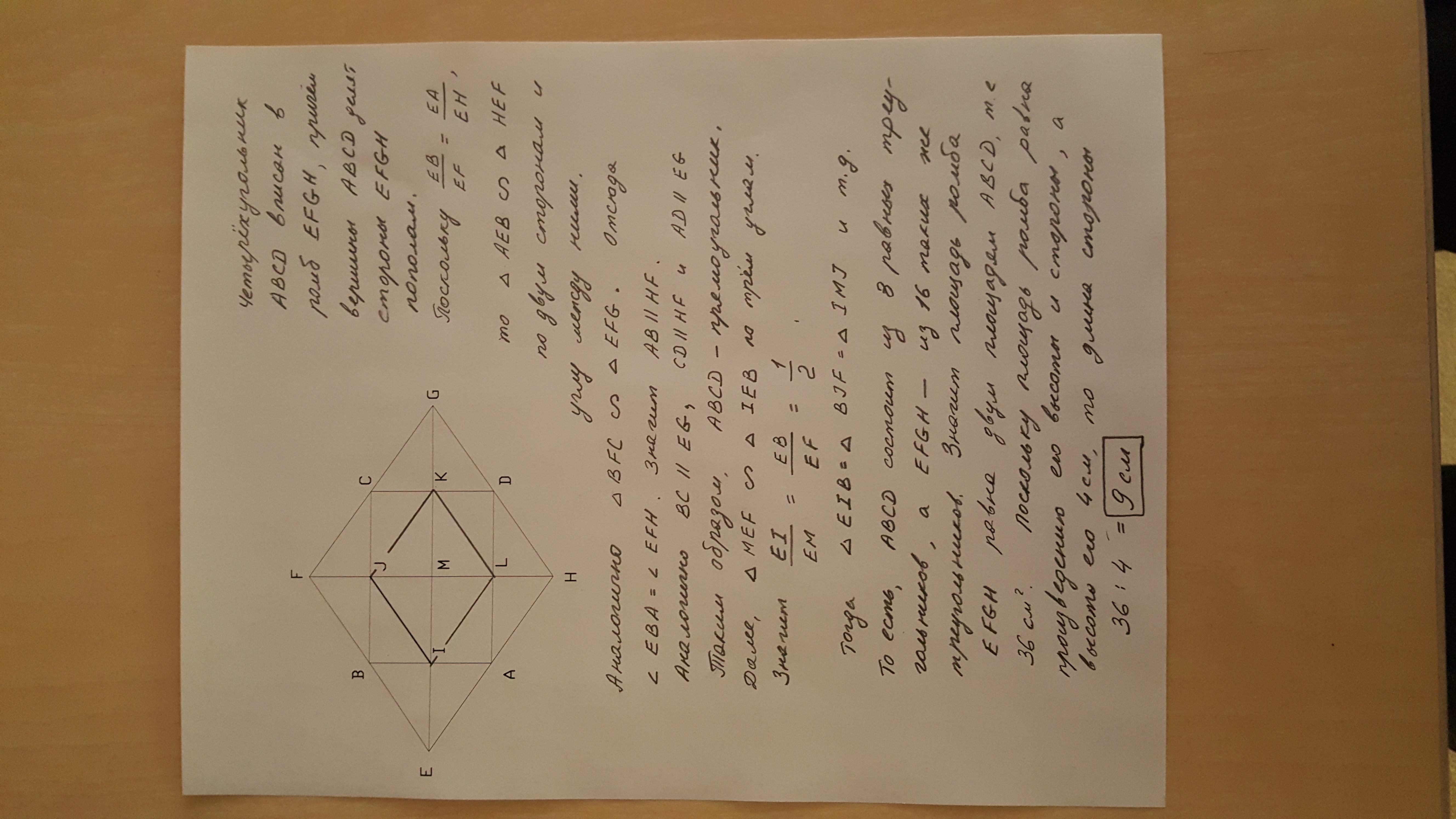 Площадь четырехугольника, вершинами которого являются середины сторон ромба равна 18 см^2. Найдите длину стороны, если его высота равна 4см.
