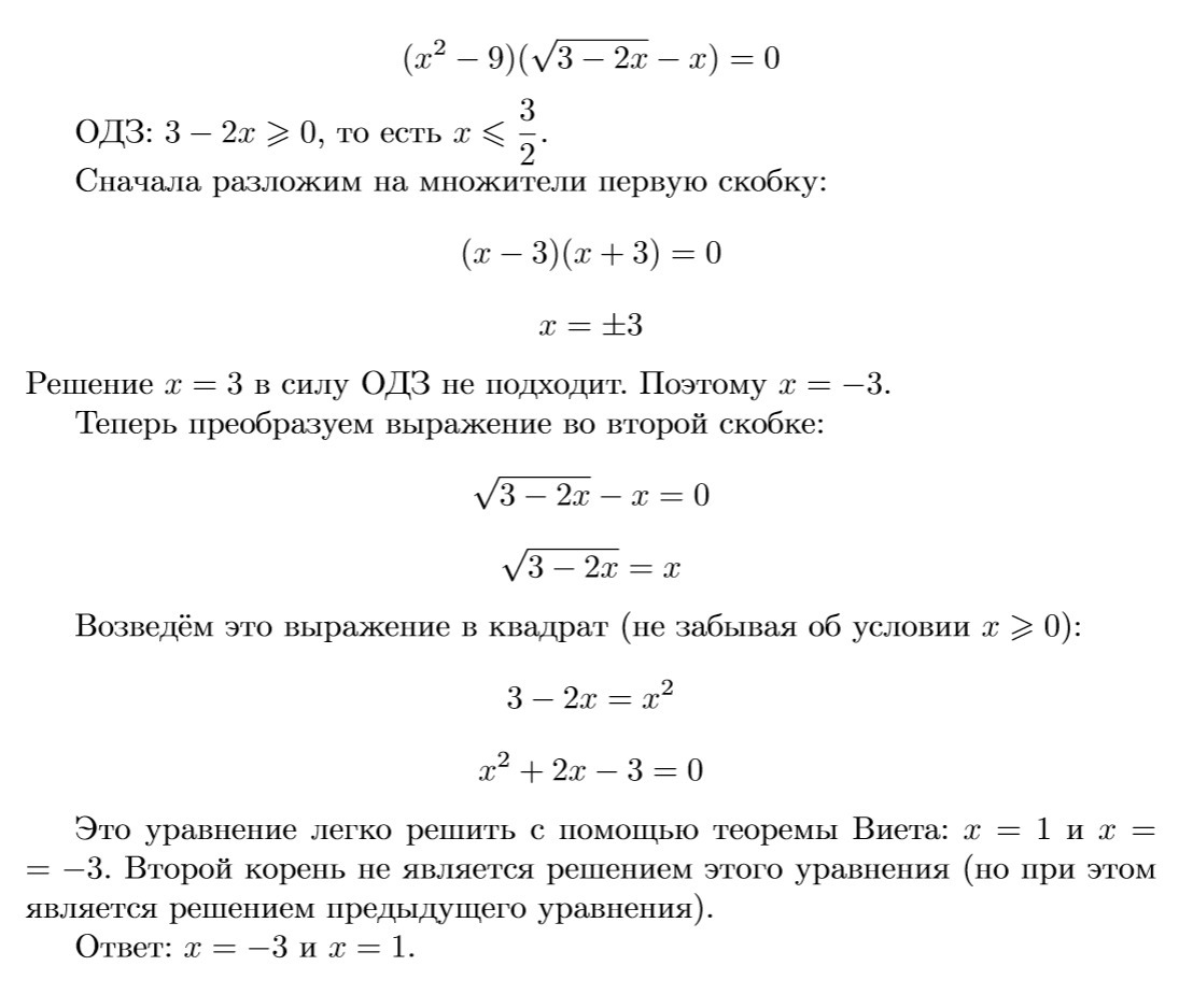Первый корень равен 1 (это легко проверить, подставив 1 вместо x в уравнение). Произведение корней равно свободному члену, то есть −3, поэтому второй корень равен −3 : 1 = −3