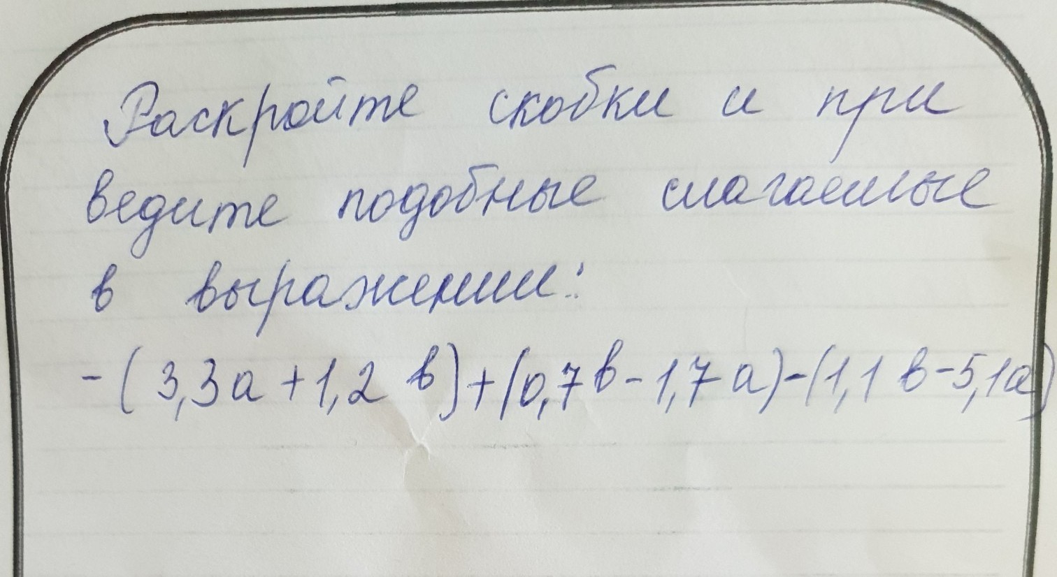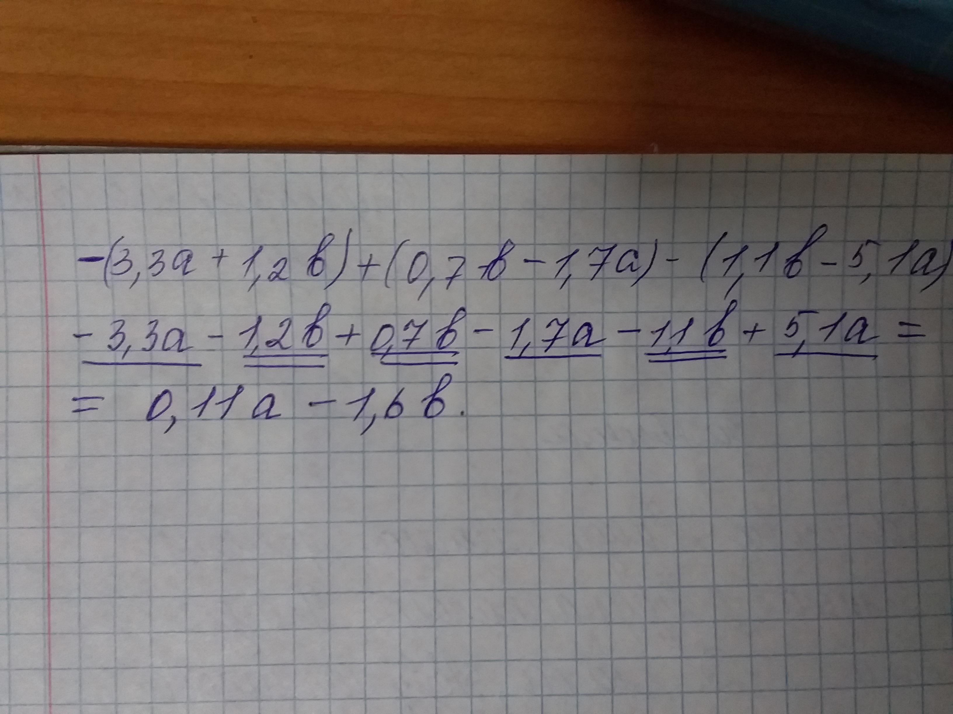 -3,3a-1,2b+0,7b-1,7a-1,1b+5,1a= -3,3a-1,7a+5,1a-1,2b+0,7b-1,1b= 0,1a-1,6b