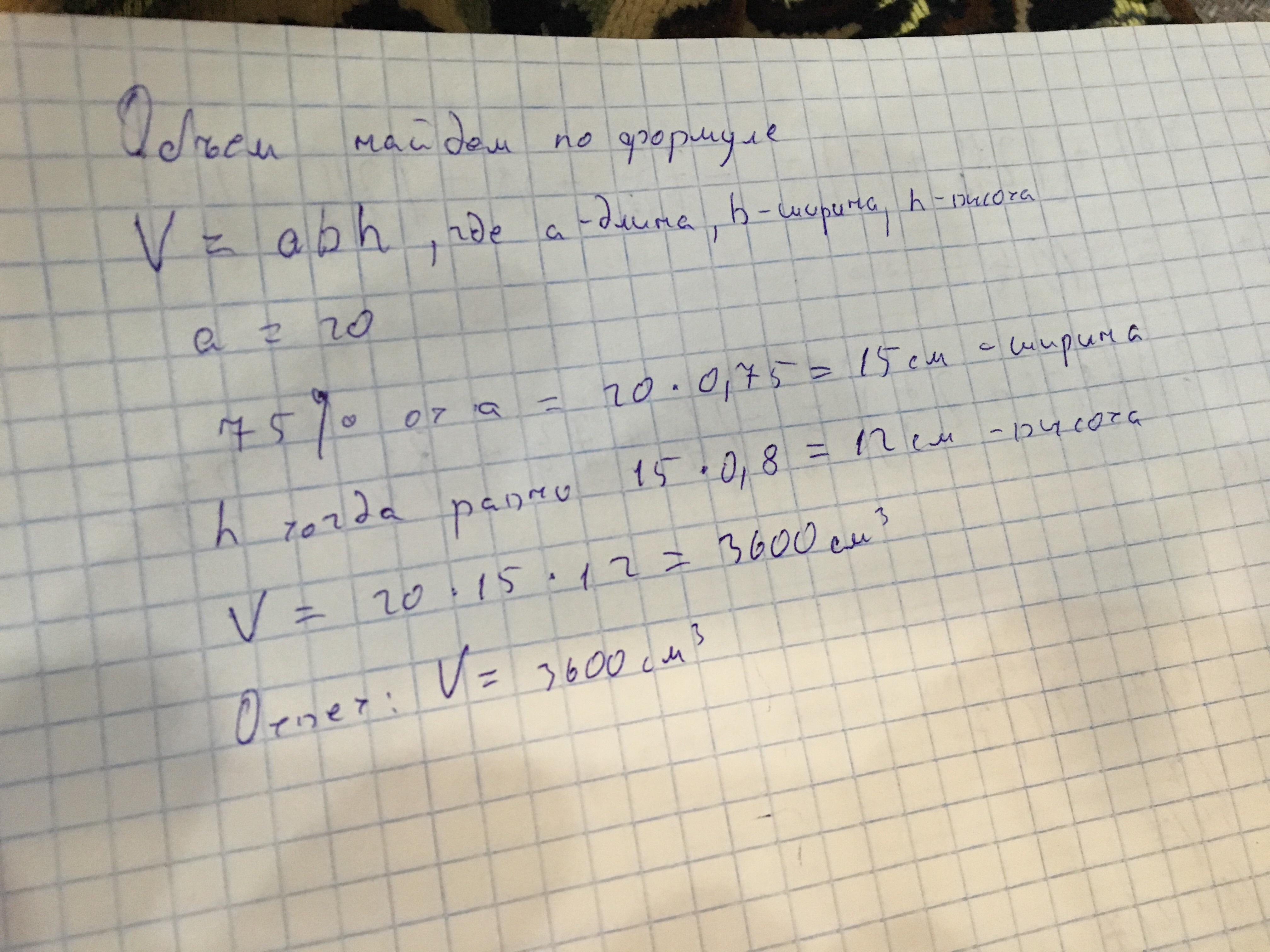 Длина ящика а см, ширина составляет 75% длины, а высота 80% ширины. Найдите объем ящика. Вычислительная при а =20
