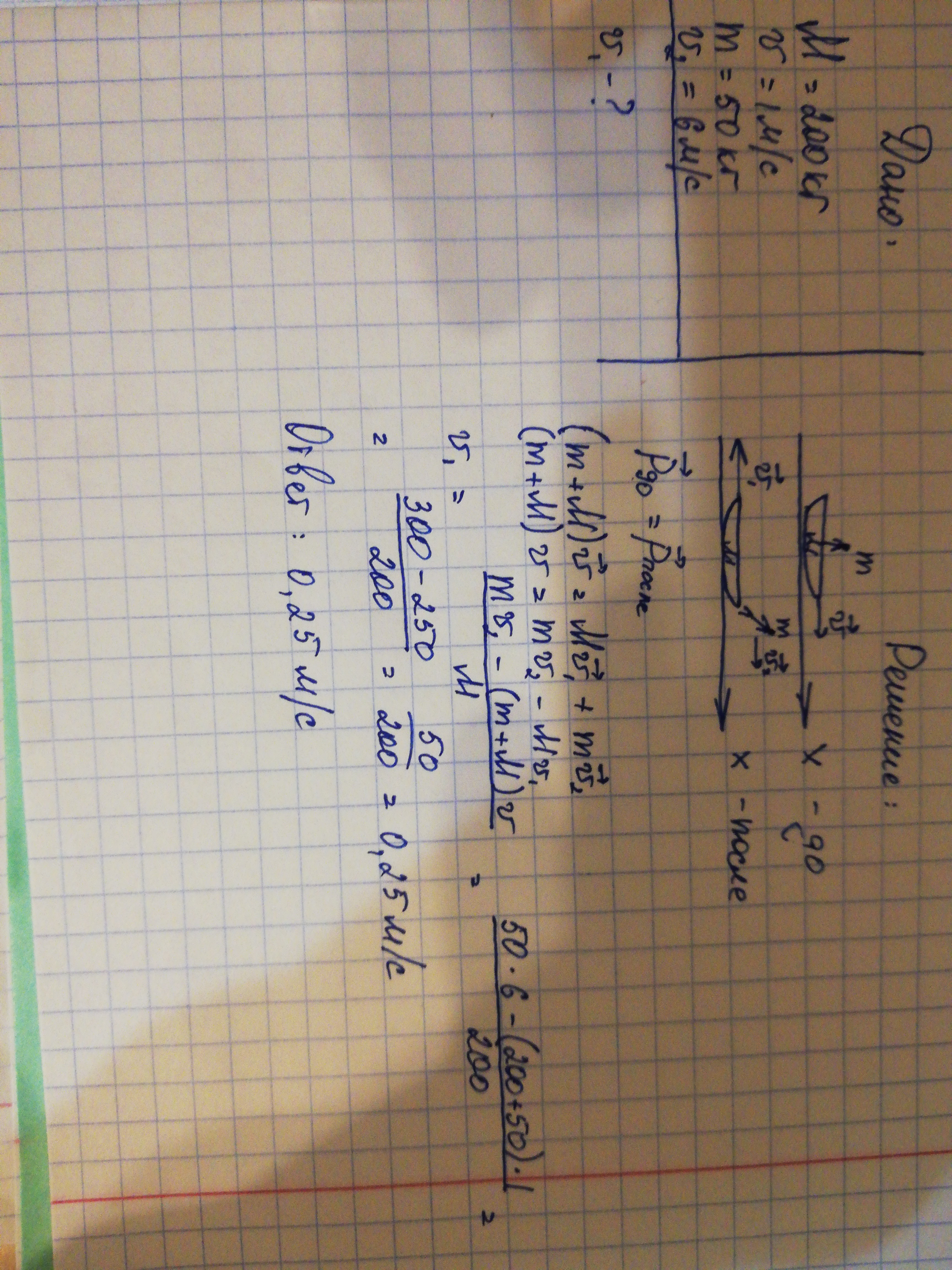 С лодки массой 200 кг, движущейся со скоростью 1м/с ныряет мальчик массой 50 кг, двигаясь в горизонтальном направлении. Какой станет скорость лодки после прыжка мальчика, если он прыгает с носа со скоростью 6 м/с?
