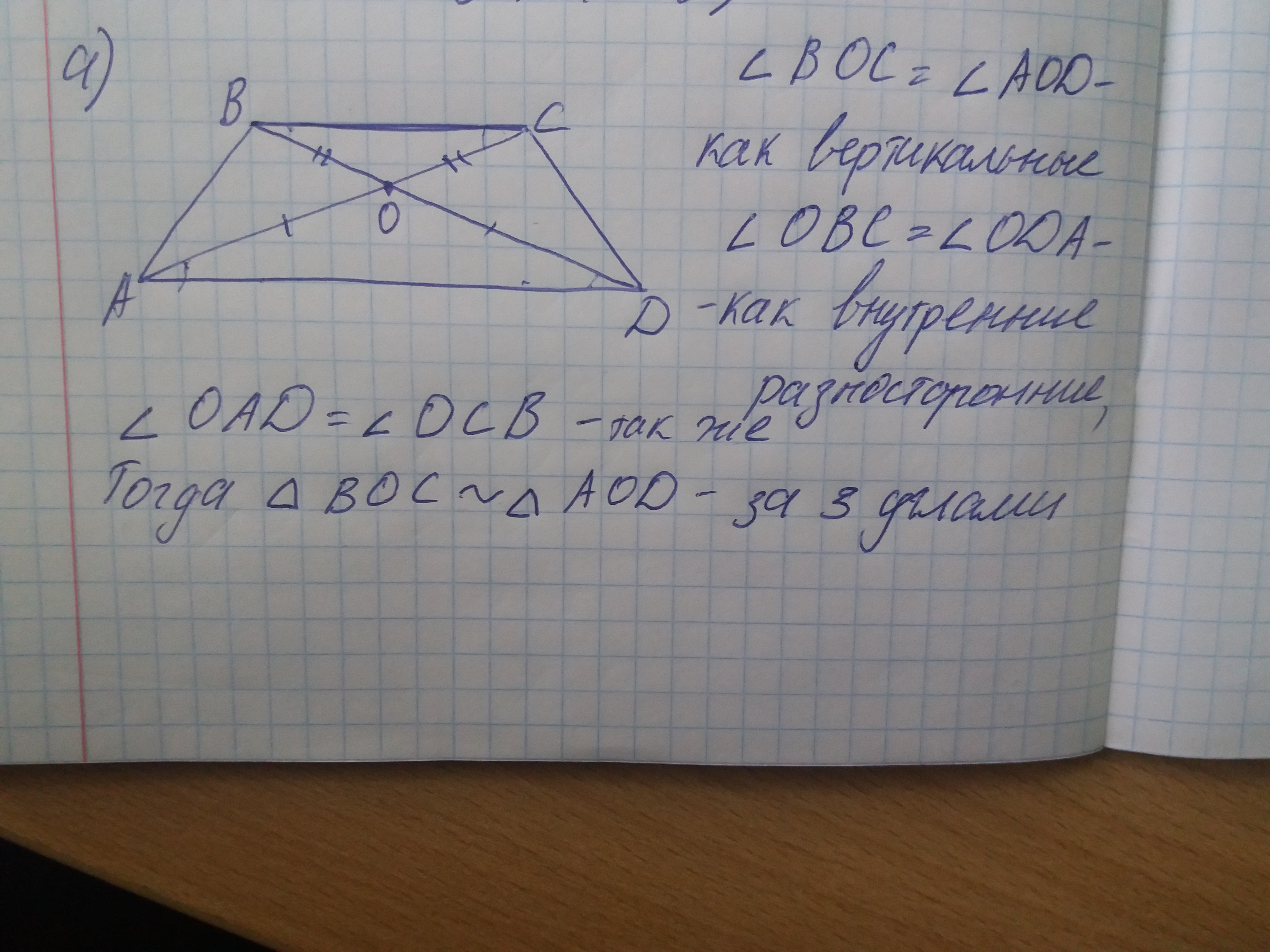 В трапеции ABCD с основаниями AD и BC диагонали AC и BD пересекаются в точке О. а) докажите, что треугольники AOD и COB подобны.