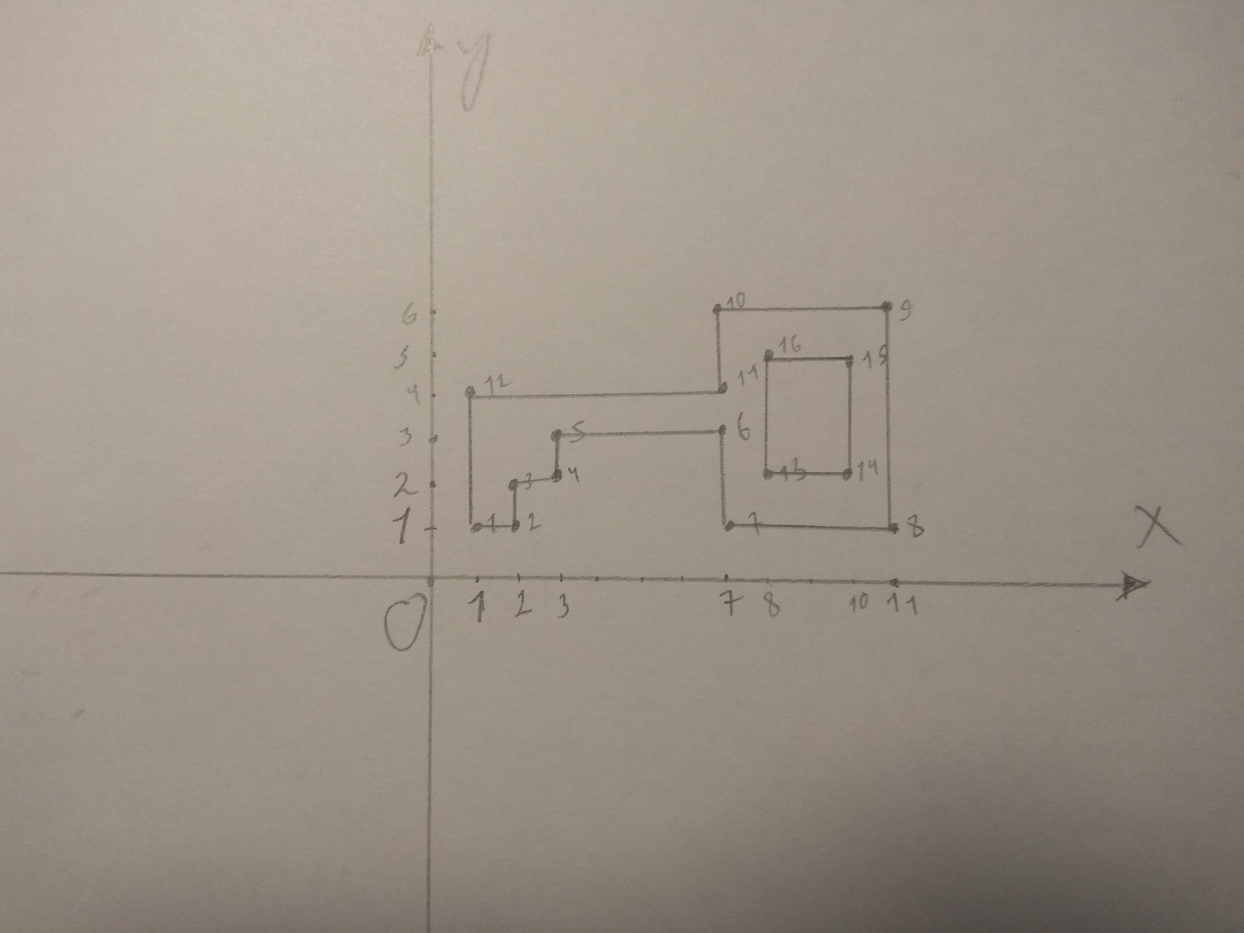 на координатной плоскости постройте и пронамеруйте точки 1 (1,1), 2(2,1), 3(2,2), 4(3,2), 5 (3,3), 6 (7,3), 7(7,1), 8 (11,1), 9 (11,6), 10 (7,6), 11 (7,4), 12 (1,4), 13 (8,2), 14(10,2), 15 (10,5), 16 (8,5). соединине точки в заданной последовательности :1-2-3-4-5-6-7-8-9-10-11-12-1и13-14-15-16-13что что получилось на рисункие?
