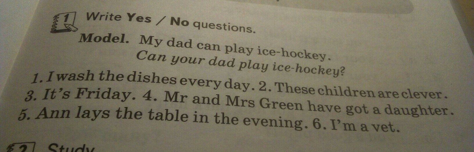 Do YOU (I) wash the dishes every day? Are these children clevere? Is it Friday? Gave Mr and Ms Green have got a daughter? Does Ann lay the table in the evening? Are you(am I) a vet