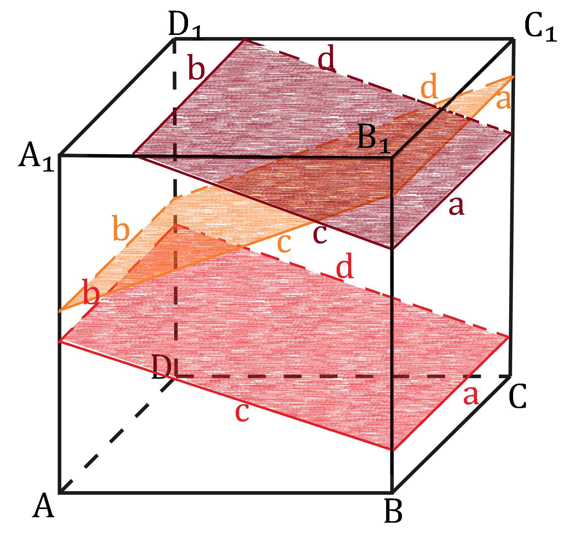 У прямоугольника противоположные стороны параллельны, а угол между смежными сторонами 90°. У смежных граней куба двугранный угол 90°. Чтобы получить в сечении прямоугольник, необходимо провести сечение плоскостью, которая будет параллельна какому-то ребру куба. Таким образом a,b ⊥ (AA₁B₁) и (CC₁D₁), значит a,b⊥c,d т.к. эти прямые (c,d) принадлежат плоскостям, которые перпендикулярны a,b.