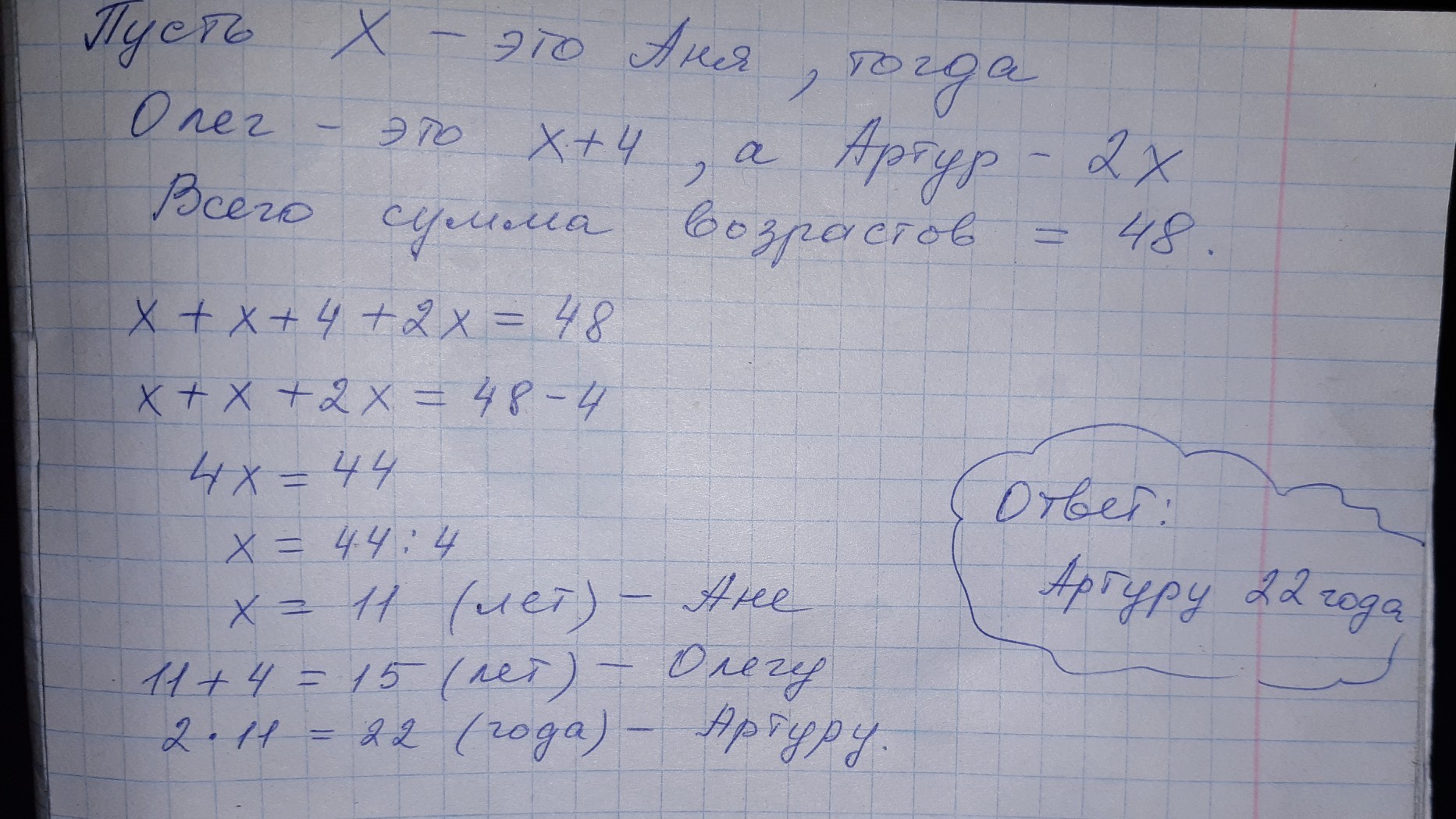 Помогите решить задачу! Олег старше Ани на 4 года, а Артур старше Ани в 2 раза. Сколько лет Артуру, если сумма всех возрастов 48 лет.
