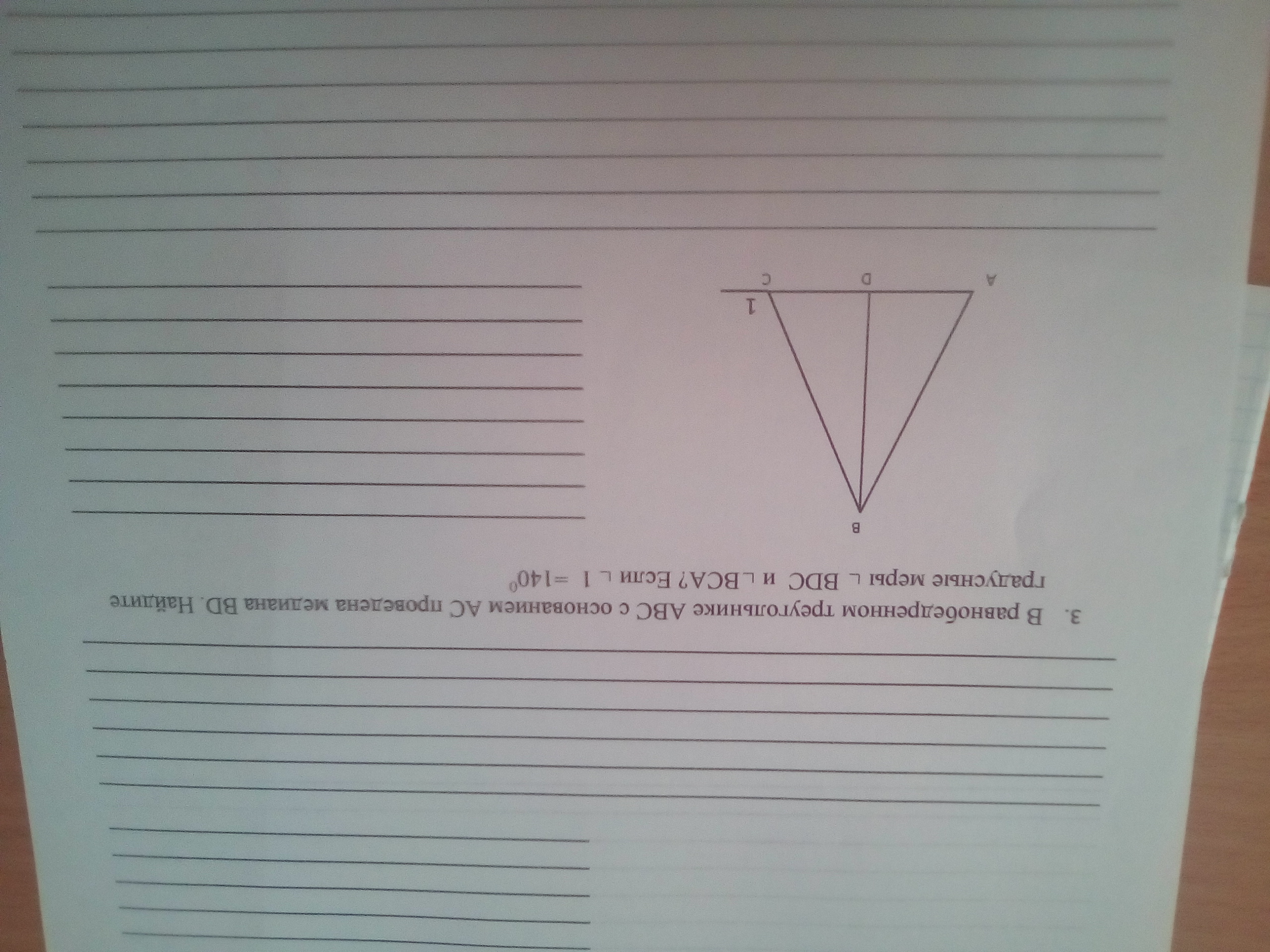 Решение: Так как Δ АВС равнобедренный, а ВД - медиана, то она же будет являться и биссектрисой и высотой, т.е. сразу определим, что ∠ΔВДС = 90°. ∠1 является внешним ∠, составляющий с ∠ВСА развернутый угол, ∠1=180-140=40°.