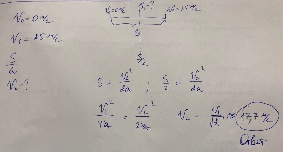Автомобиль,движется от остановки ровноускорено ,достиг скорости 25м/с.найдите его скорость в среднем пункте прямолинейной траектории
