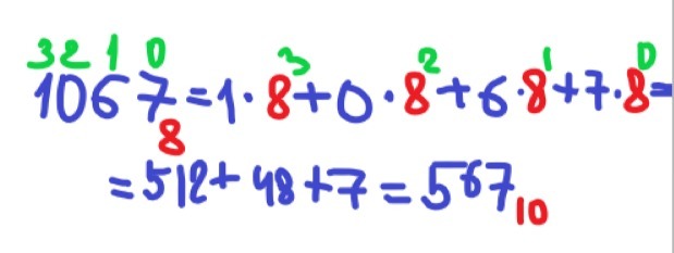 Объясню : для перевода числа из какой-либо СС в _10 мы С КОНЦА расставляем над цифрами разряды начиная с 0. После чего умножаем умножаем все цифры поочередно на основание СС в степени разряда и складываем.