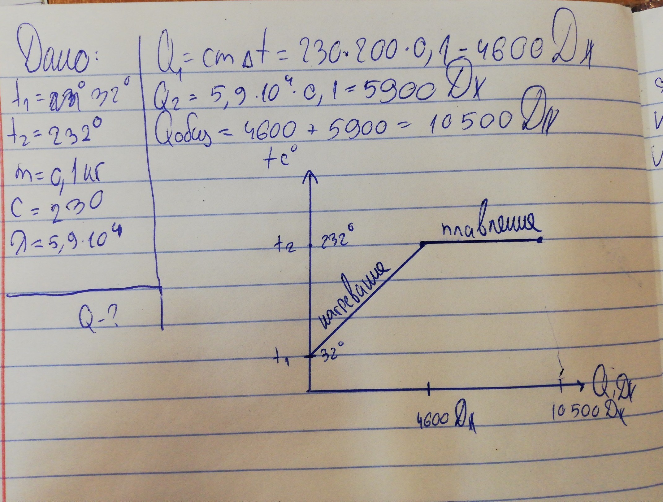 какое колво теплоты необходимо для плавления 100 г олова, взятого при температуре 32 градуса? изобразите этот процес на графике