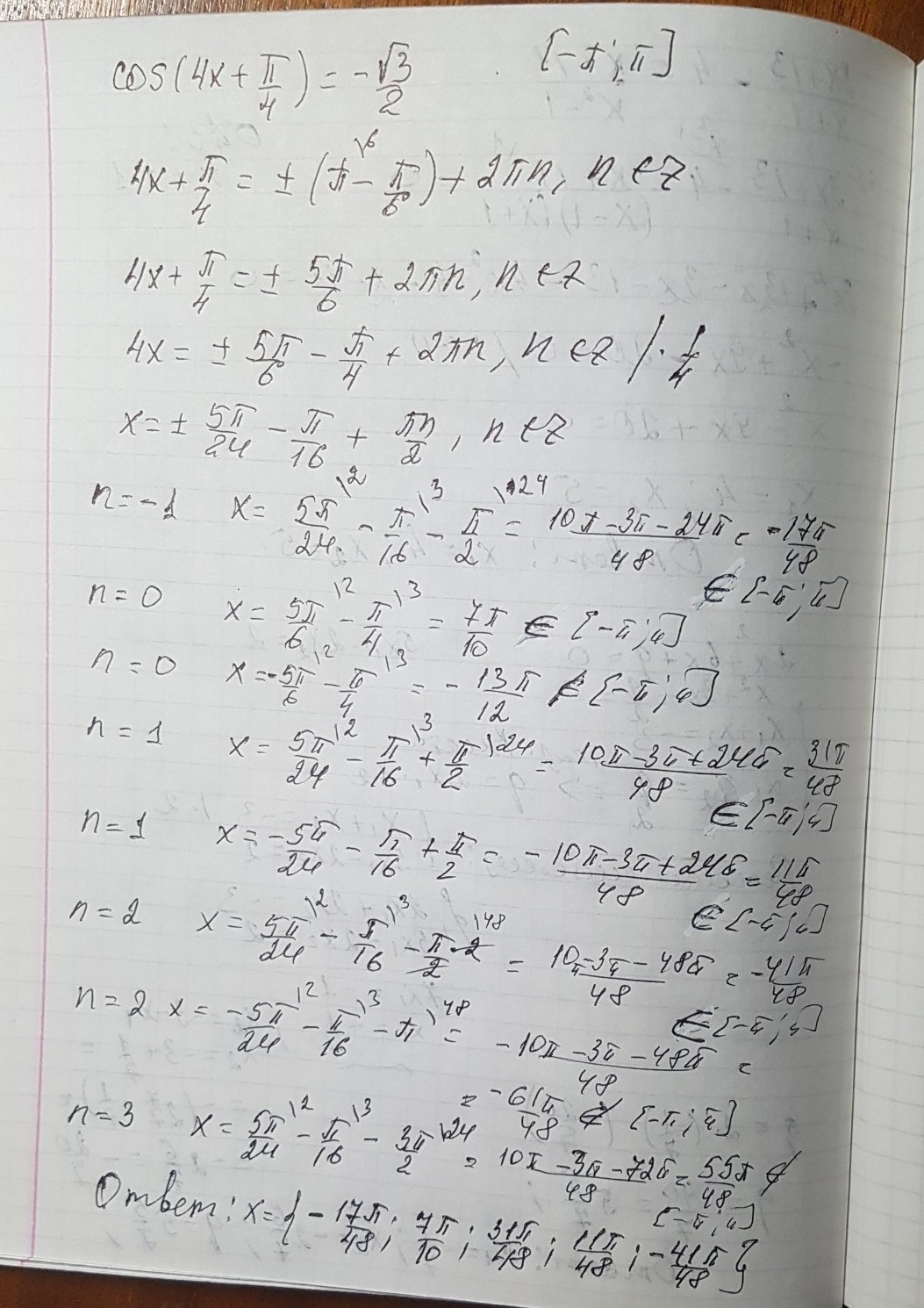 найдите корни уравнения cos(4x + п/4) = -(√3 / 2) принадлежащее промежутку [-п;п)