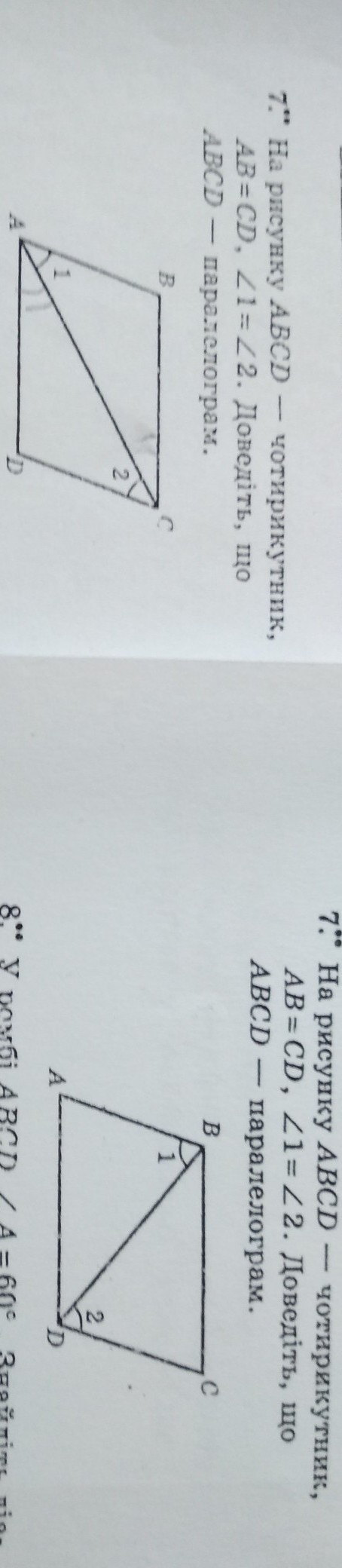 раз угол1 равен углу 2 то можно их рассмотреть как накрест лежащие углы при секущей ас, следовательно , раз AB=CD и они параллельны, значит это параллелограмм