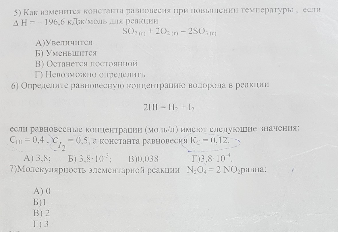 5. ΔH < 0 . В этом случае, температурный коэффициент логарифма константы равновесия отрицателен. Повышение температуры уменьшает величину константы равновесия, т.е. смещает равновесие влево. Ответ: Б