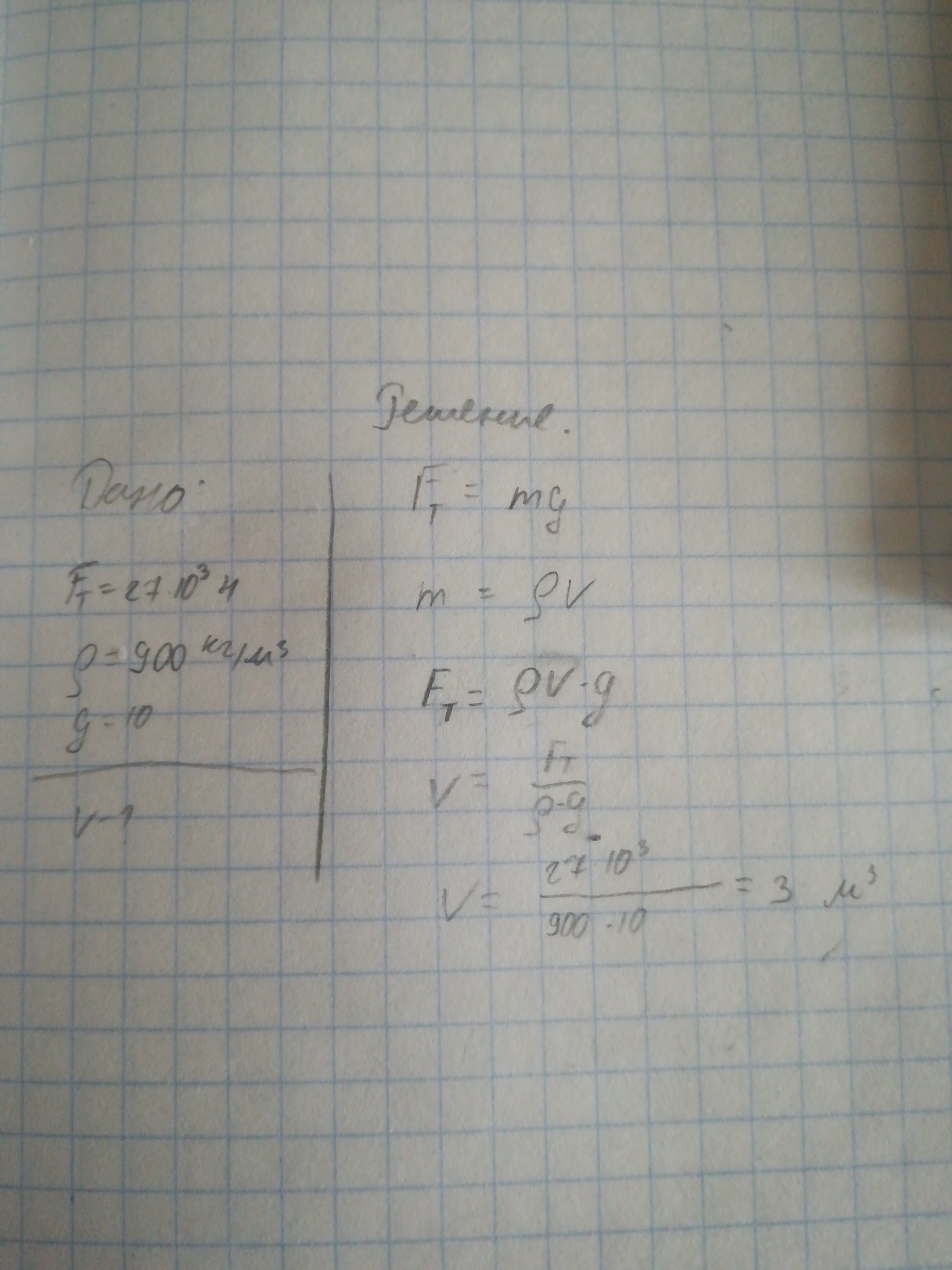 Найдите объём ледяной глыбы на которую действует сила тяжести – 27 kH, если плотность льда - 900 кг/м^3.