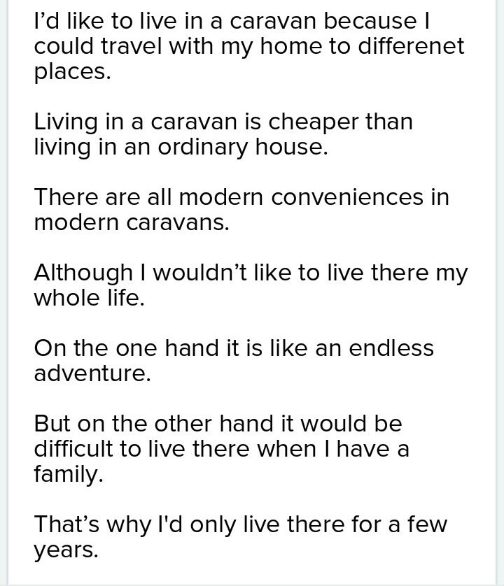 Ответ : Я хотел бы жить в караване, потому что я мог путешествовать с моим домом для различных места. Жить в караване дешевле, чем живет в обычном доме. Есть все современные удобства, в современные караваны. Хотя я не хотел бы жить там вся жизнь. С одной стороны это как бесконечный приключение. Но с другой стороны было бы сложно жить, когда у меня