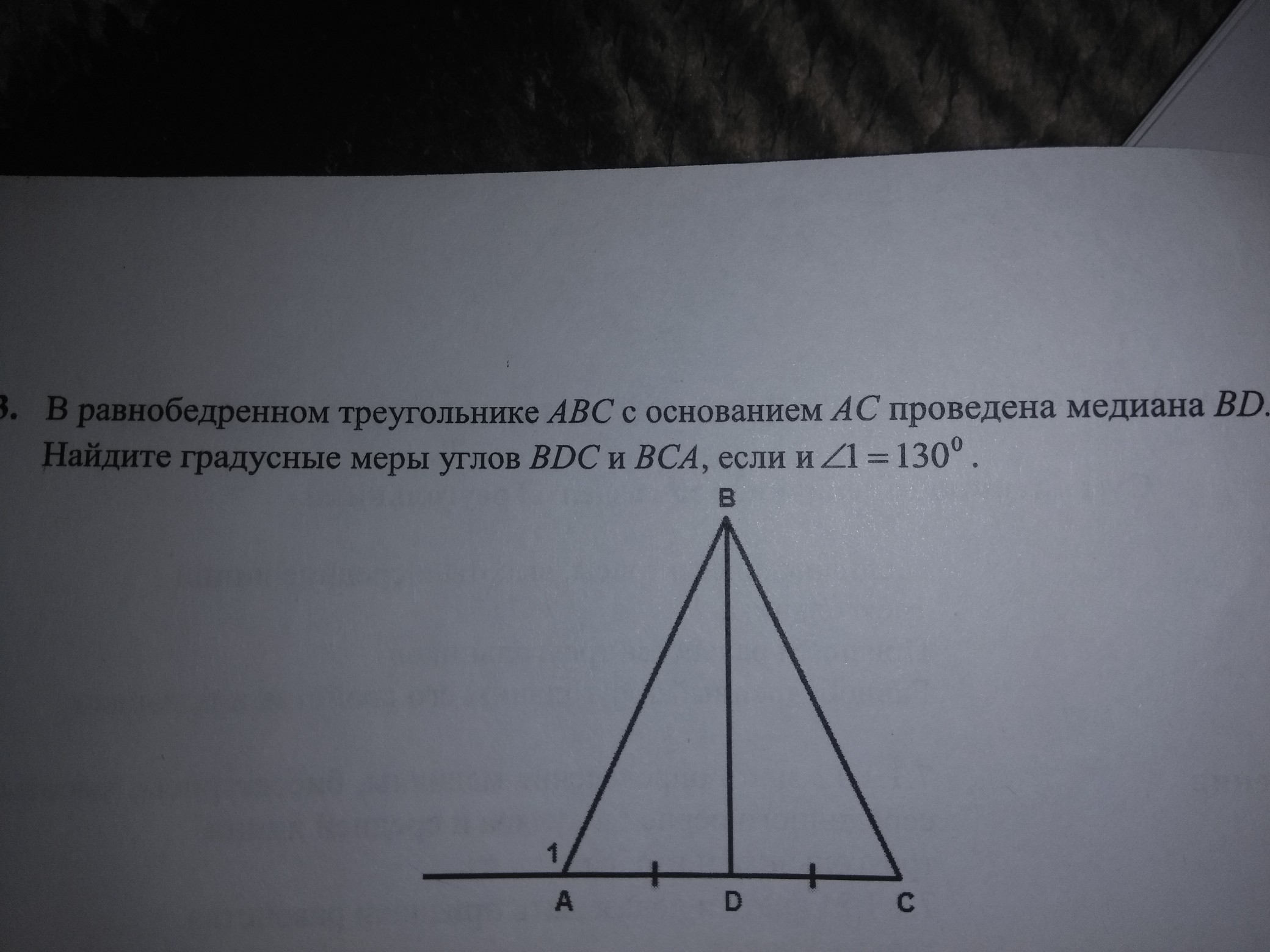 в равнобедренном треугольнике авс с основанием ас проведена медиана вд найдите градусные меры углов вдс вса, если угол 1 равен 130 градусов. Пожалуйста, завтра СОР. Плииииз