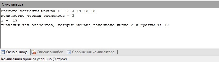 Дан массив целых чисел, состоящий из 5 элементов. Заполнить его с клавиатуры. Найти: количество четных элементов; вывести значения тех элементов, которые меньше заданного числа Z и кратны 4.