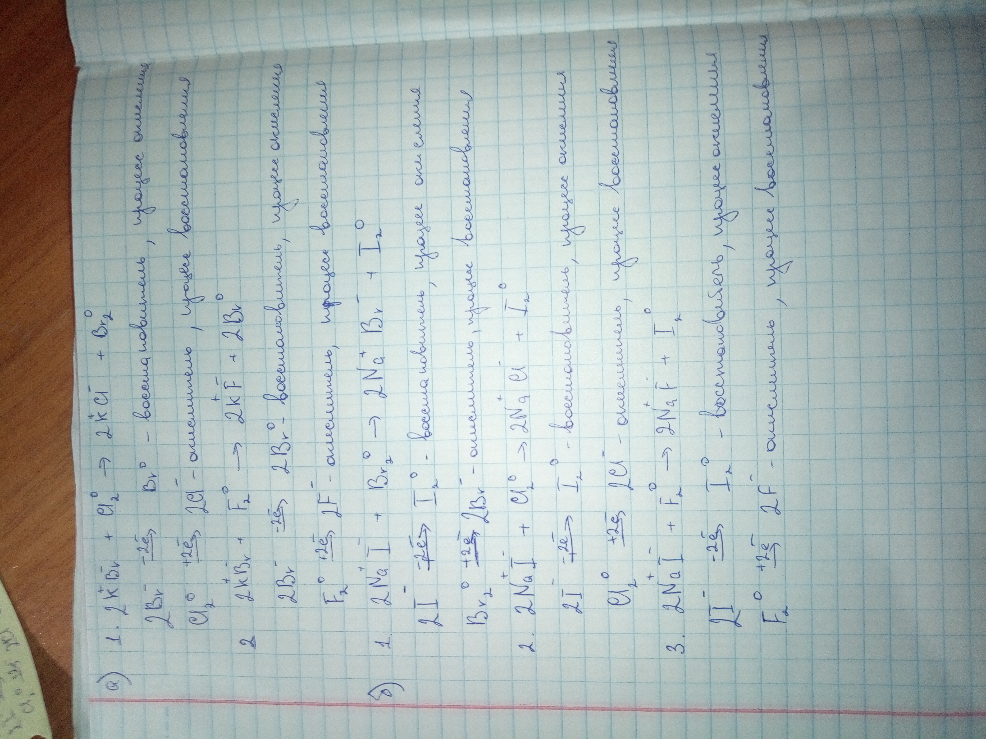 Какие из галогенов реагируют: а) с бромидом калия, б) иодидом натрия? Напишите уравнения возможных реакций, для каждой из них укажите окислитель и восстановитель