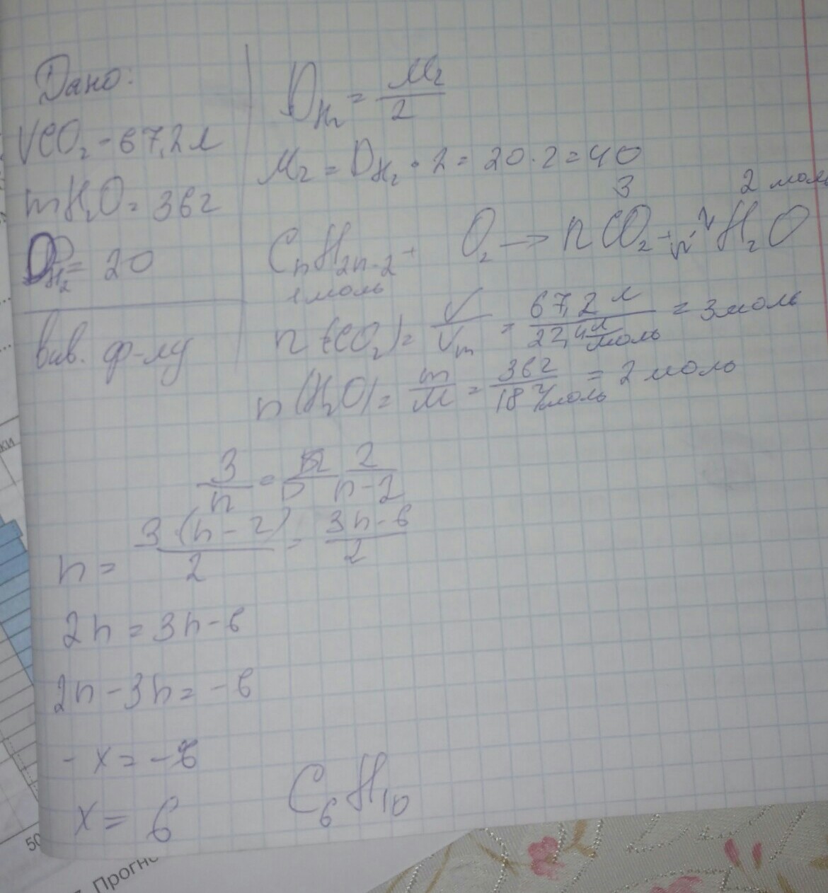 При сгорании неизвестного алкина выделилось 67,2 л. углекислого газа и 36 г. воды (при нормальных условиях). Определить формулу алкина, если известно, что относительная плотность неизвестного вещества по водороду равна 20.