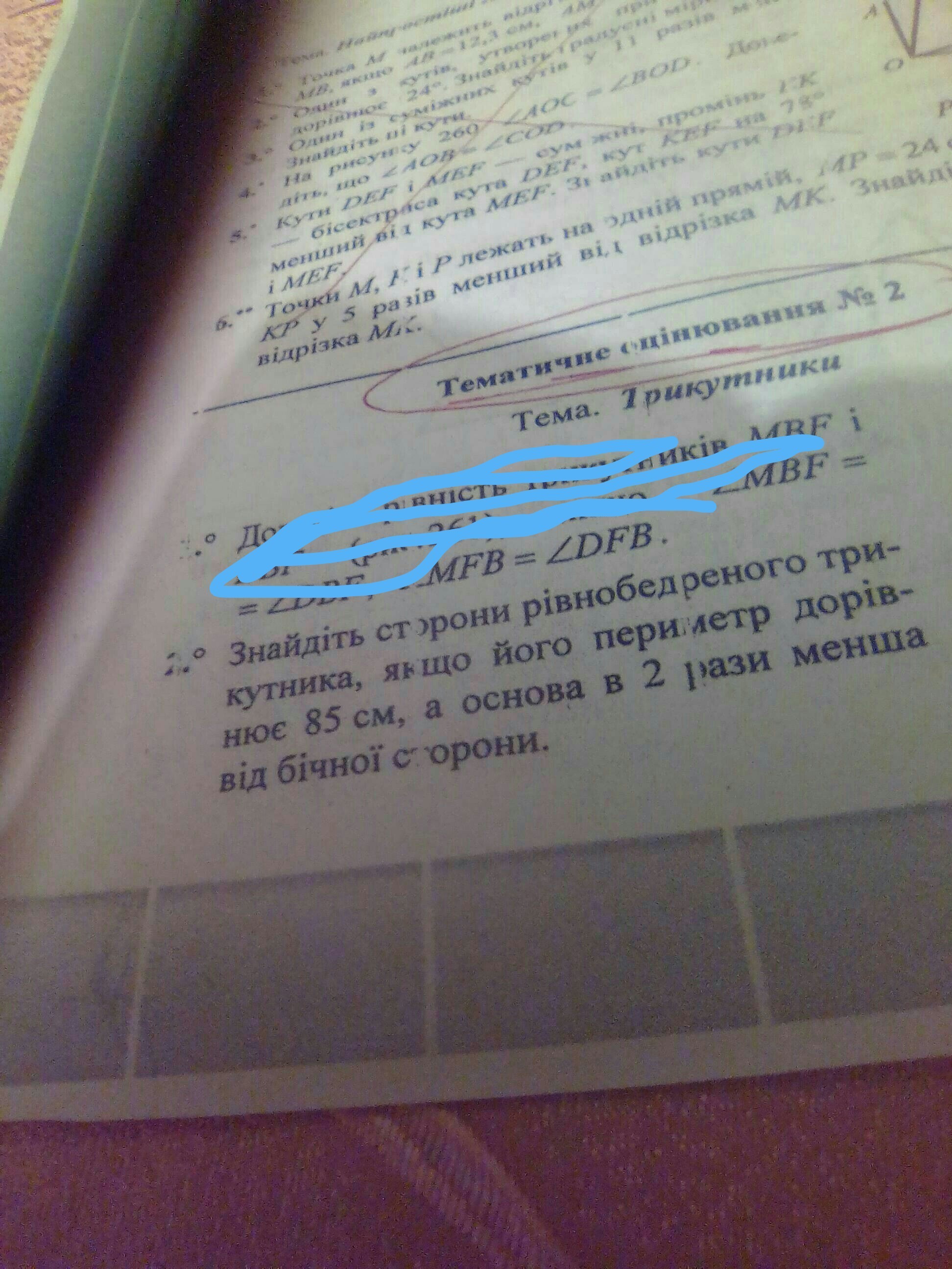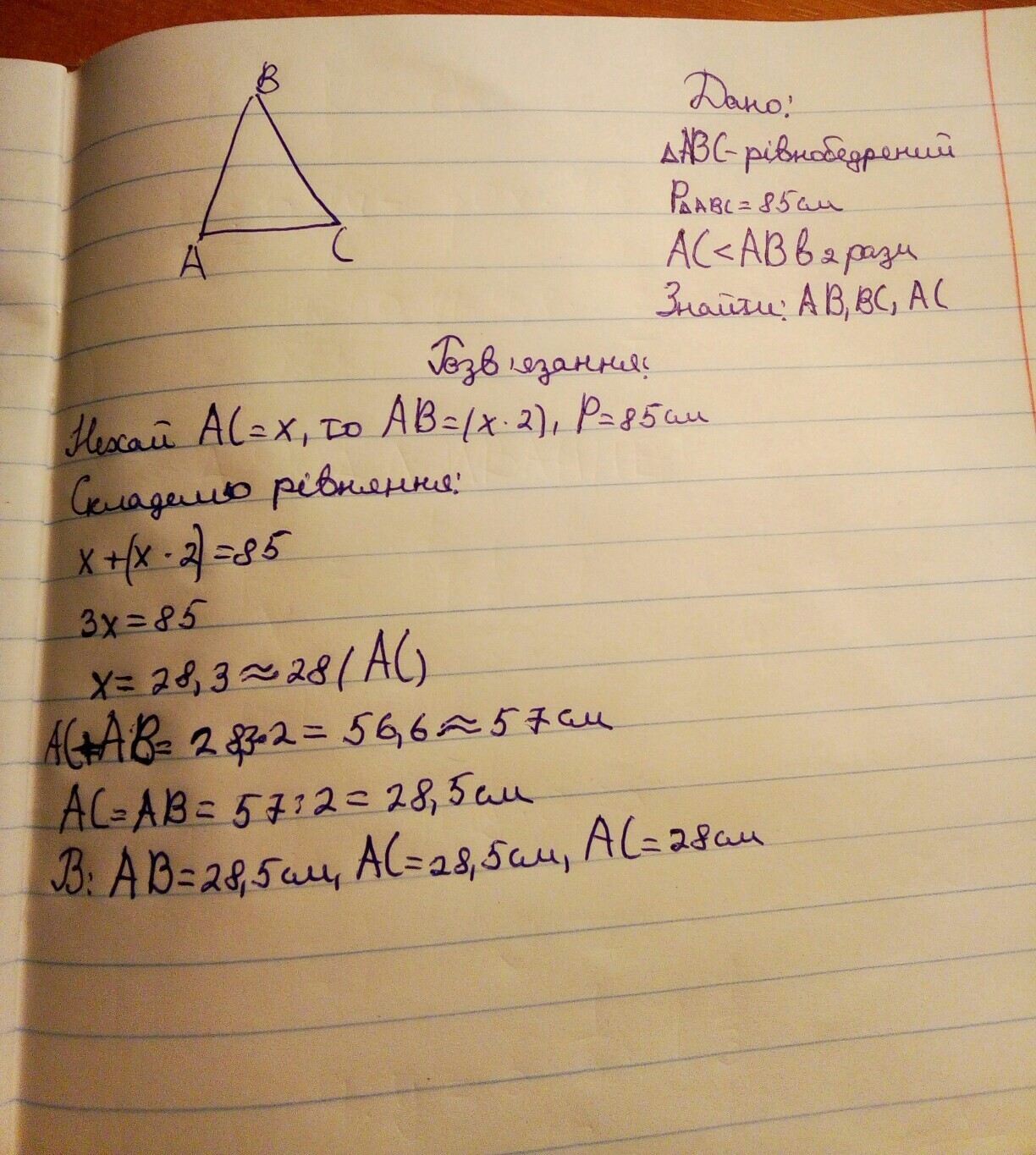 Знайдіть сторони рівнобедреного трикутник а якщо його периметр дорівнює 85 см а основа в 2 рази менше від бічноі сторони