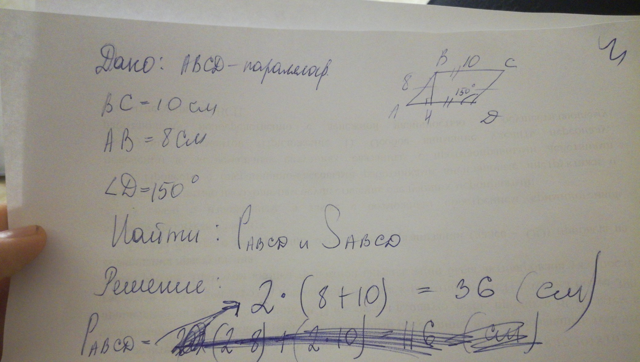 Стороны параллелограмма равны 10 см и 8см, а один из углов равен 150°. Найдите площадь и периметр параллелограмма. Помогите пожалуйста.
