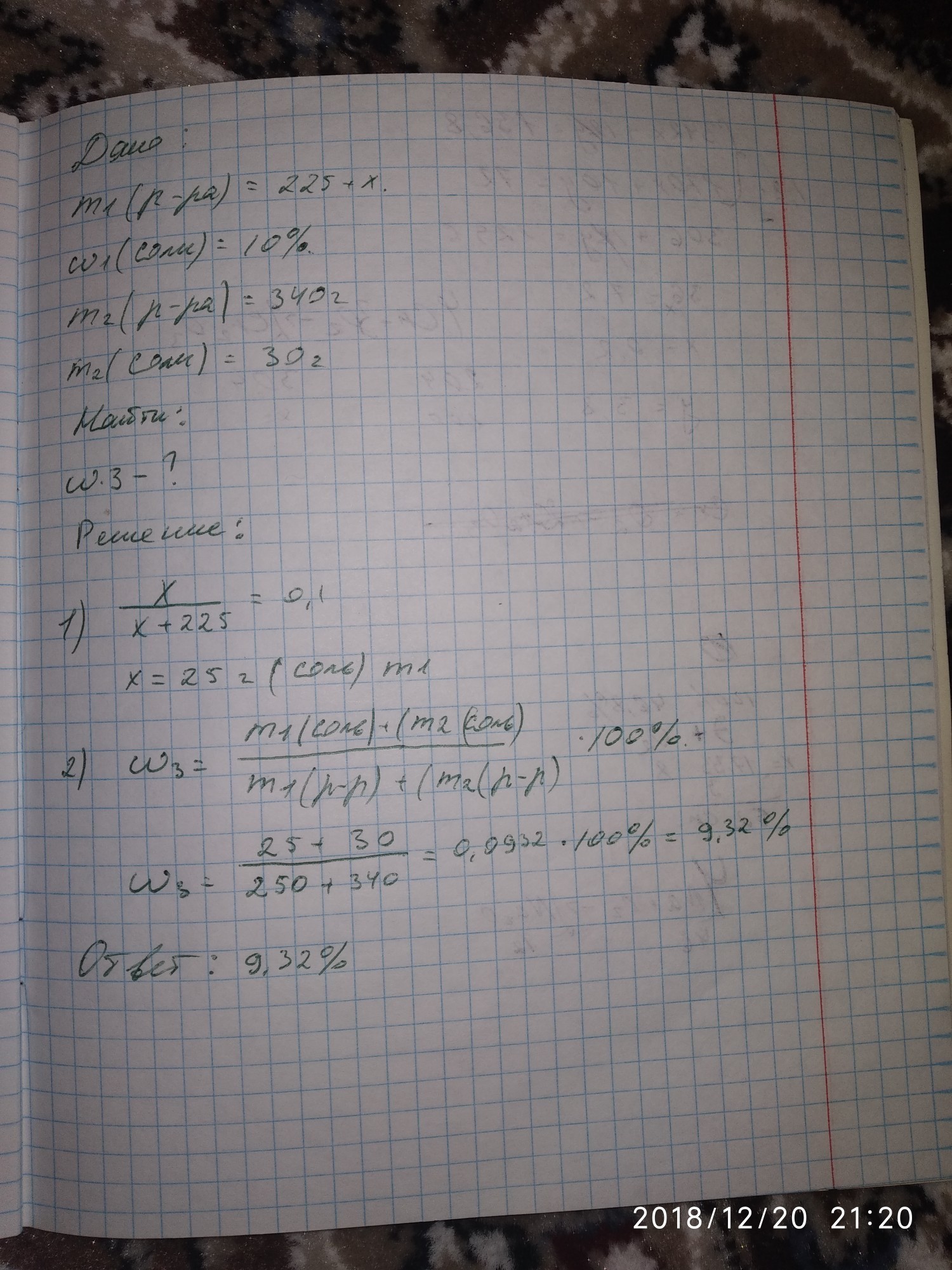 Рассчитать массовую долю соли в полученном растворе,если слить растворы:1)W1=10%,m1(H2O)=225г. 2)m2(cоли)=30г.,m2(H2O)=310г .