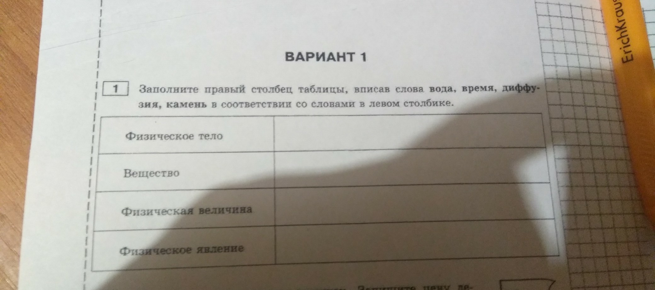 Заполните правый столбец таблицы вписав слова вода, время, диффузия, камень в соответствии со словами в левом столбике
