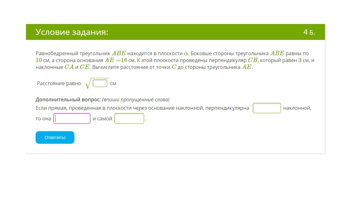 Равнобедренный треугольник ABE находится в плоскости α. Боковые стороны треугольника ABE равны по 10 см, а сторона основания AE=16 см. К этой плоскости проведены перпендикуляр CB, который равен 3 см, и наклонные CA и CE. Вычислите расстояние от точки C до стороны треугольника AE.