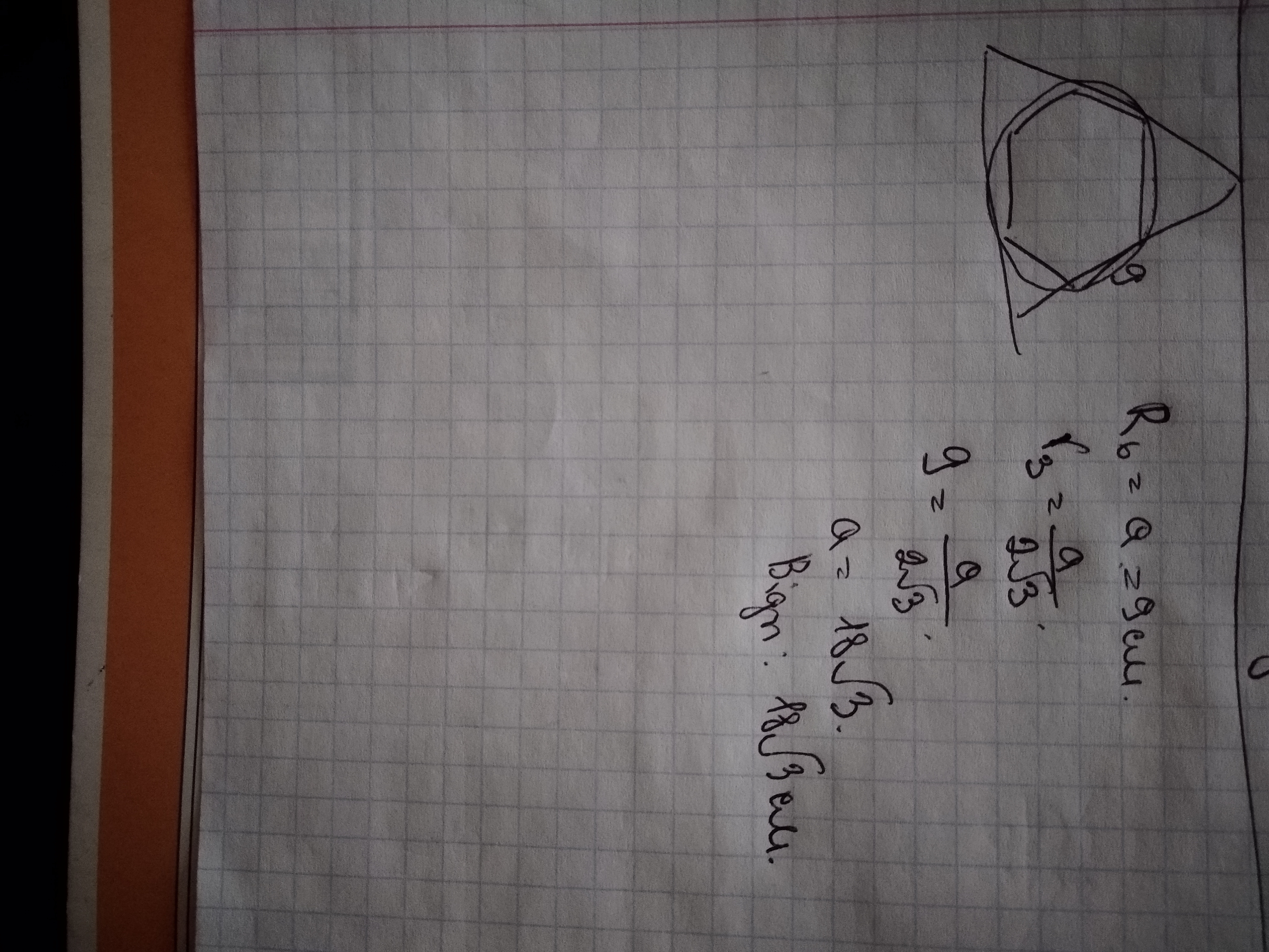 В окружность вписан правильный шестиугольник со стороной 9 см. Найдите сторону правильного треугольника, описанного около этой окружности.
