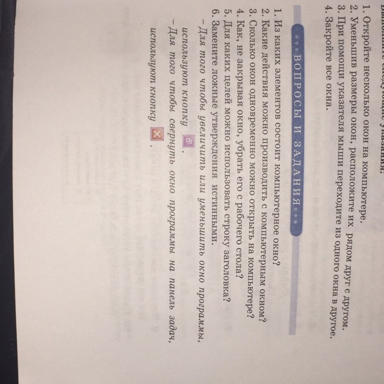 1. рамка окна , угол изменения размеров , заголовок окна , кнопки управления окном ( свернуть , развернуть закрыть );