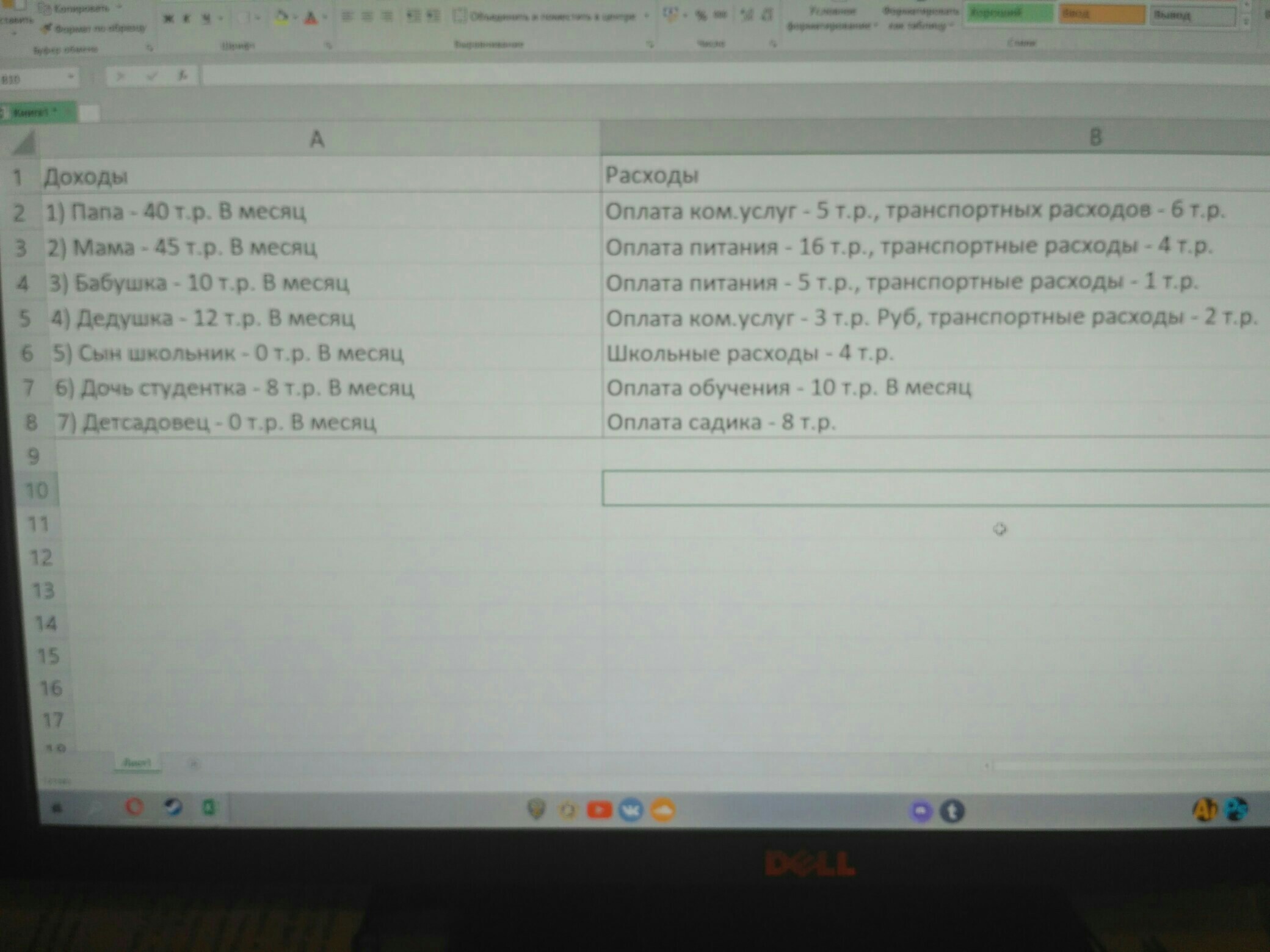 Составьте таблицу на тему "Бюджет семьи", разделив ее на два столбца: доходы и расходы. Взять семь пунктов: бабушку, дедушку, папу, маму, сын школьник, дочь студентка и детсадовец.