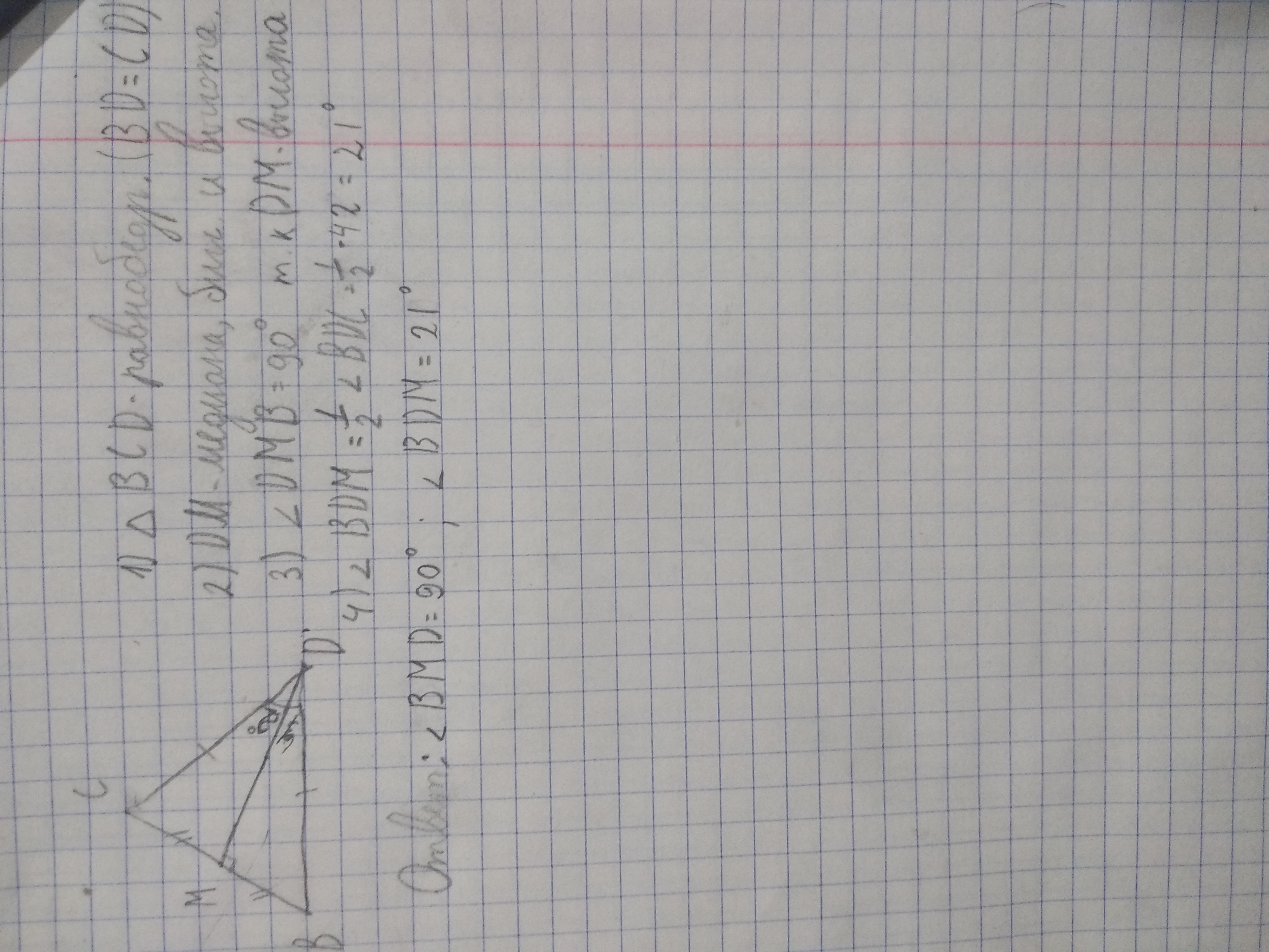 в треугольнике BCD стороны BD и CD равны DM медиана угол bdc равен 42 градусам Найдите углы bmd и bdm