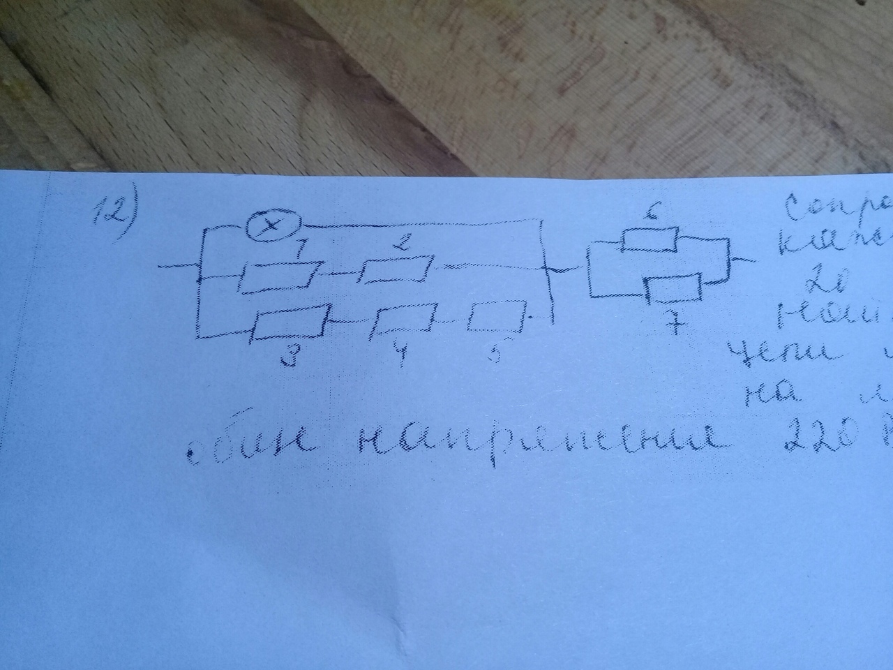 Сопротивление каждого резистора 20 Ом,лампы 15 Ом. Найдите общее R цепи и напряжение на лампе,если общее напряжение 220 В,а I6=3А. СРОЧНО!!!