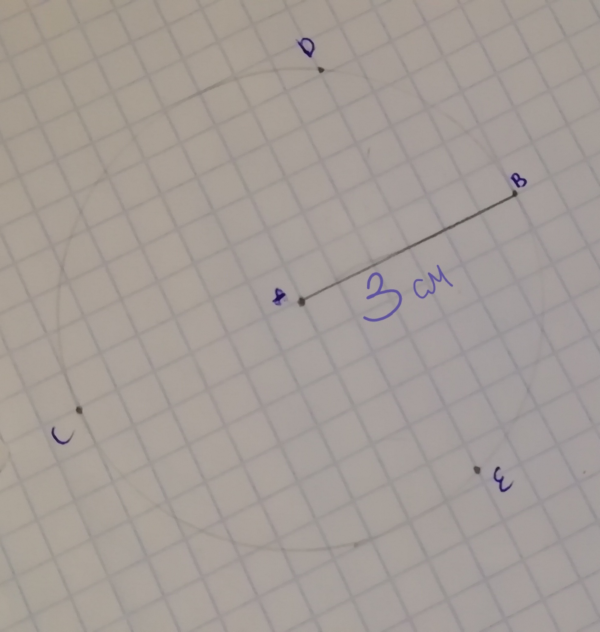 отметьте две точки A и B так чтобы AB равно 3 см с помощью циркуля постройте еще три точки C D и Е которые находились бы от точки А на расстоянии 3 см