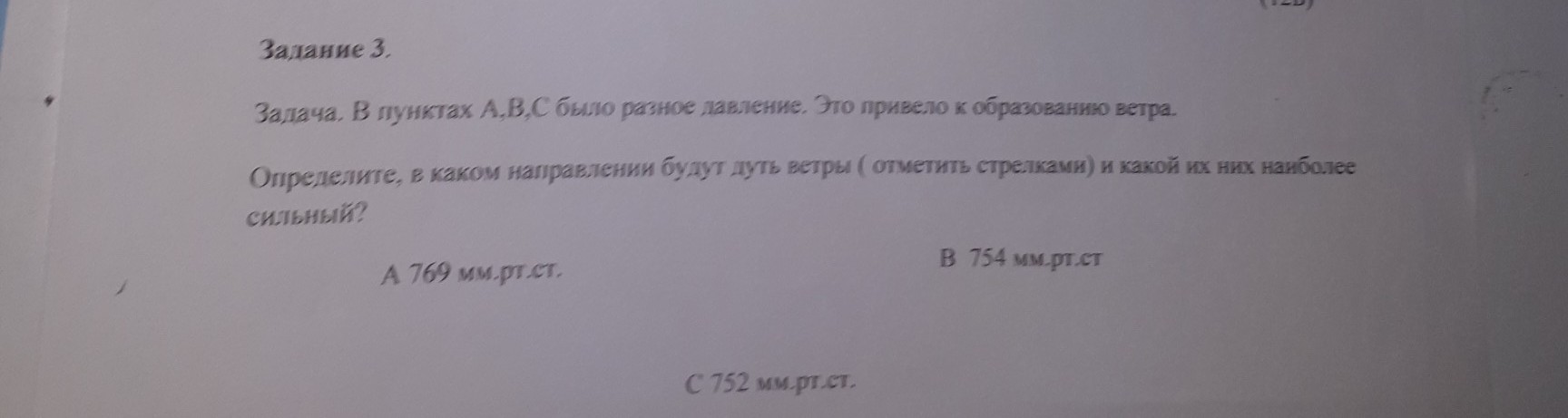 Задача.В пунктах A,B,C было разное давление.Это привело к образованию ветра.