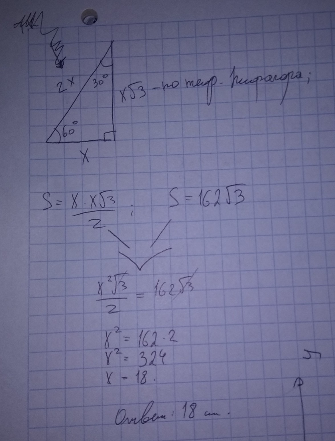 Площадь прямоугольного треугольника равна 162√3 Один из острых углов равен 60°. Найдите длину катета, прилежащего к этому углу.