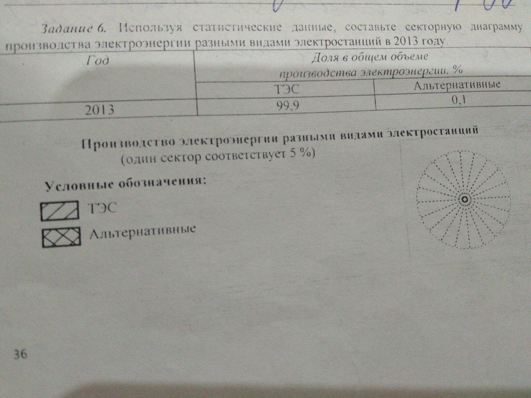 Надо поделить один сектор на 5 кусочков и первый закрасить условный знаком альтернытивные, а всё остальное условный обозначением ТЭС