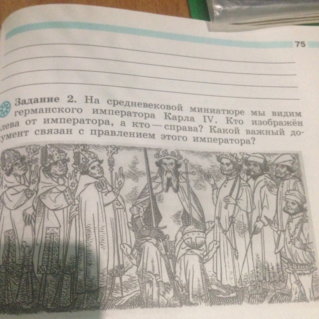 Ну средние века миниатюре мы видим Германского императора Карла четвёртого кто изображен слева от императора кто справа Какой важный документ связан направление этого императора