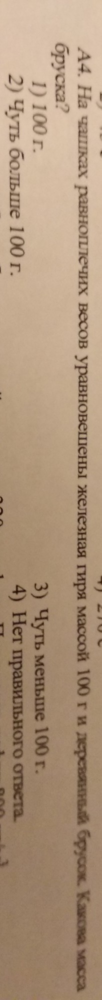 на чашках равноплечих весов уравновешаны железная гииря массой 100г и деревянный брусок.Какова масса бруска. а)100г б)чуть больше 100г в)чуть меньше 100 грамм 4)нет правильного ответа