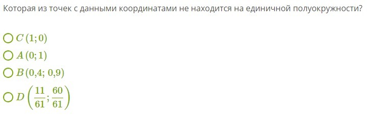 Для координат x и y любой точки A(x;y) на единичной полуокружности справедливо тождество x2+y2=1.