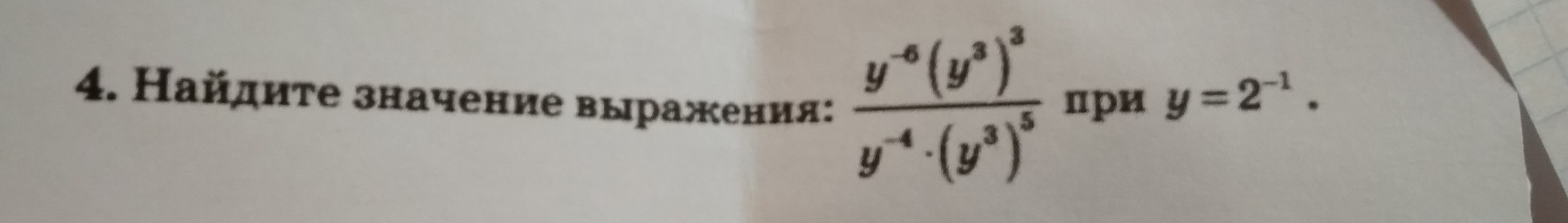 frac{y^{-6}*(y^{3})^{3}}{y^{-4}*(y^{3})^{5}}=frac{y^{-6}*y^{9}}{y^{-4}*y^{15}}=frac{y^{-6+9} }{y^{-4+15} }=frac{y^{3} }{y^{11} }=y^{3-11} =y^{-8}\\(2^{-1})^{-8}=2^{8}=256