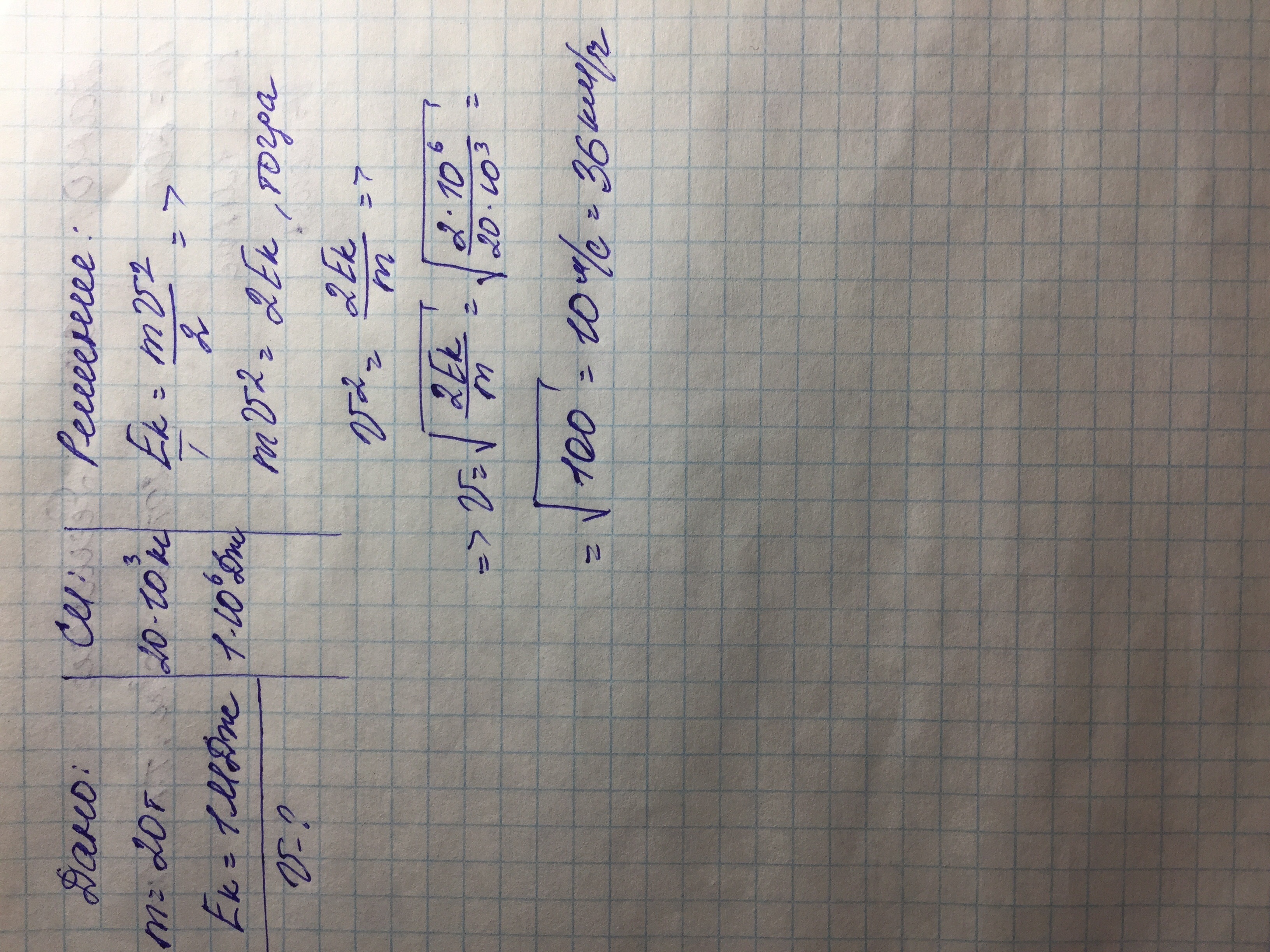 Трамвай массой 20 т во время равномерного движения имеет кинетическую энергию 1 МДж. Чему равна скорость трамвая в этот момент времени? Ответ выразите в км/ч. Пожалуйста помогите! Оформите пожалуйста по-подробнее с решением). Заранее благодарен!